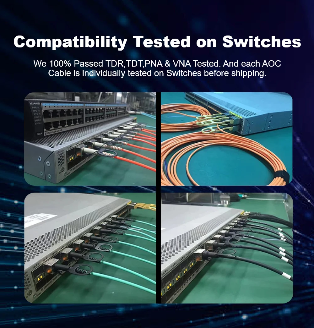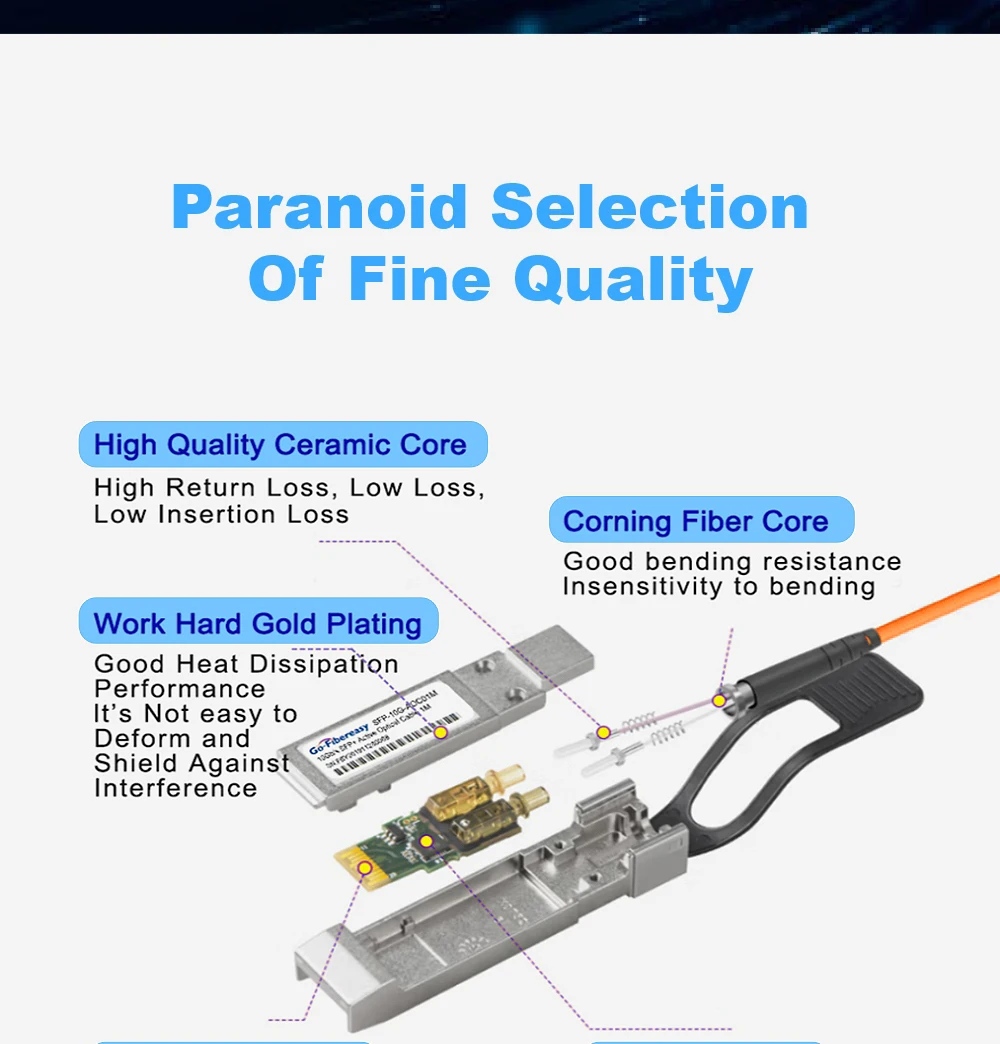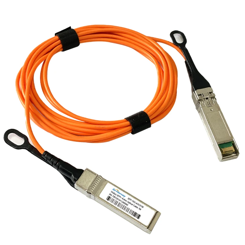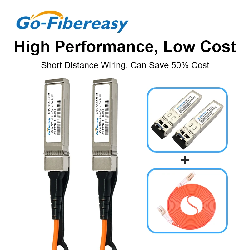 SFP+ AOC (Cable óptico activo) consta de 2 módulos SFP+ y un conjunto de cable de fibra, que transmite hasta 10 Gbps en cada dirección a través de un OM2 MMF con una distancia de hasta 100 m. SFP+ AOC se puede utilizar como una solución alternativa al SFP+ DAC (o al transceptor SFP+), al tiempo que proporciona una integridad de señal mejorada, distancias más largas, inmunidad electromagnética superior y un mejor rendimiento de tasa de error de bits.