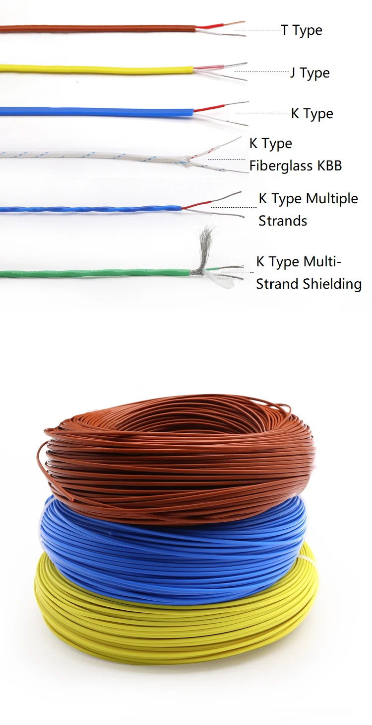 Cable de termopar tipo 2/5/10/50/100M K J T, 2 núcleos, aislador de PTFE, línea blindada, Cable de compensación de medición de alta temperatura