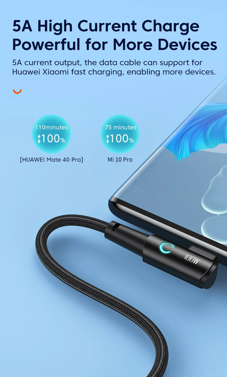 [Cable de carga rápida del codo 100W]PD 100W de carga rápida, diseño de codo de 90 grados, chip de protección segura, luz indicadora inteligente