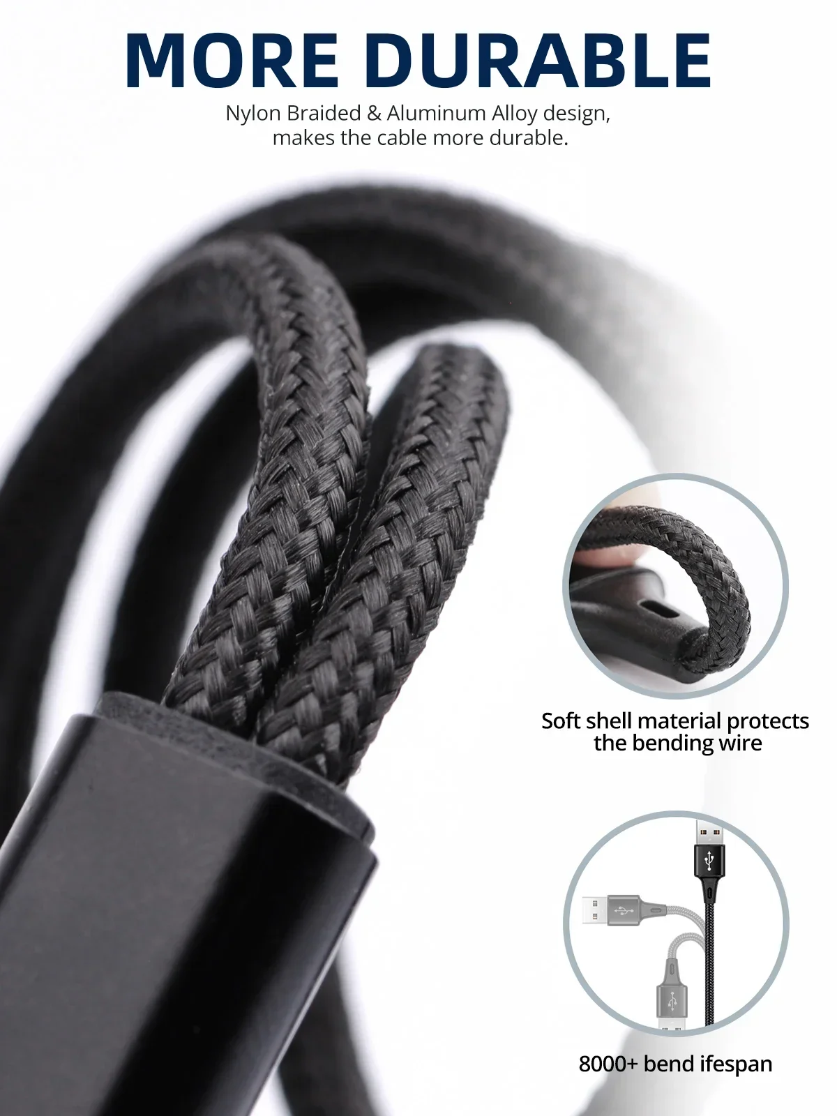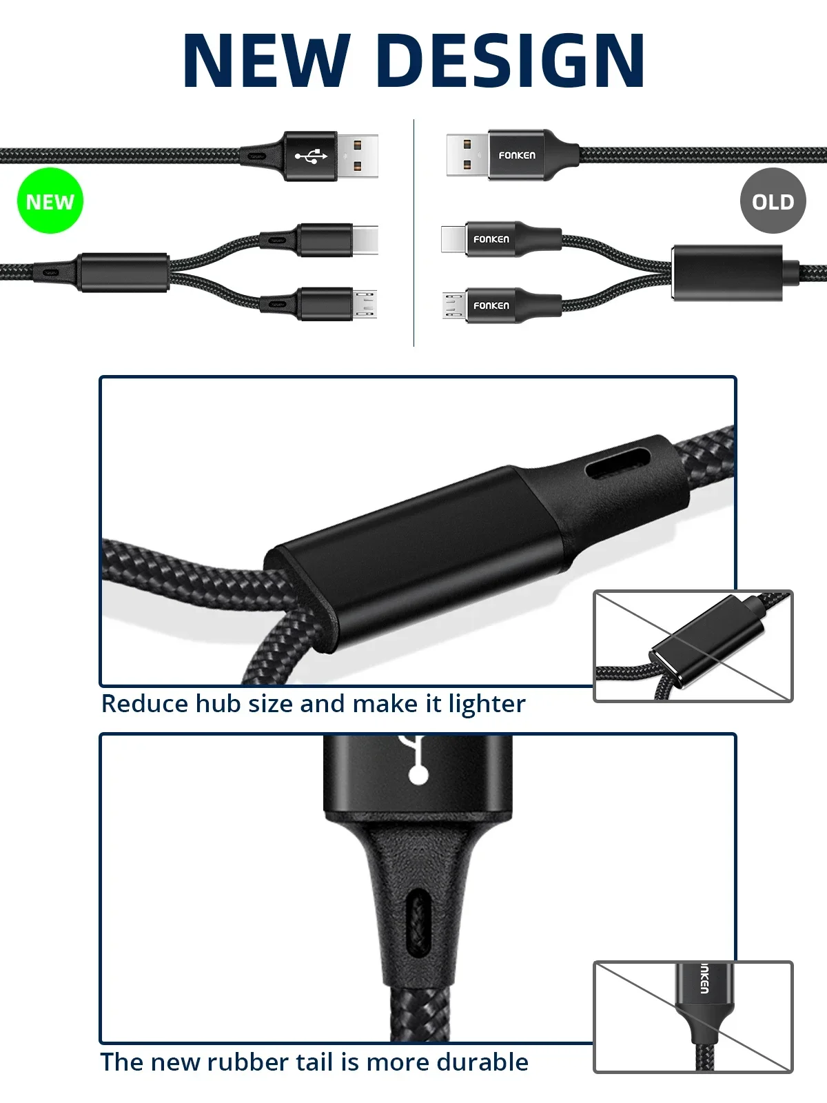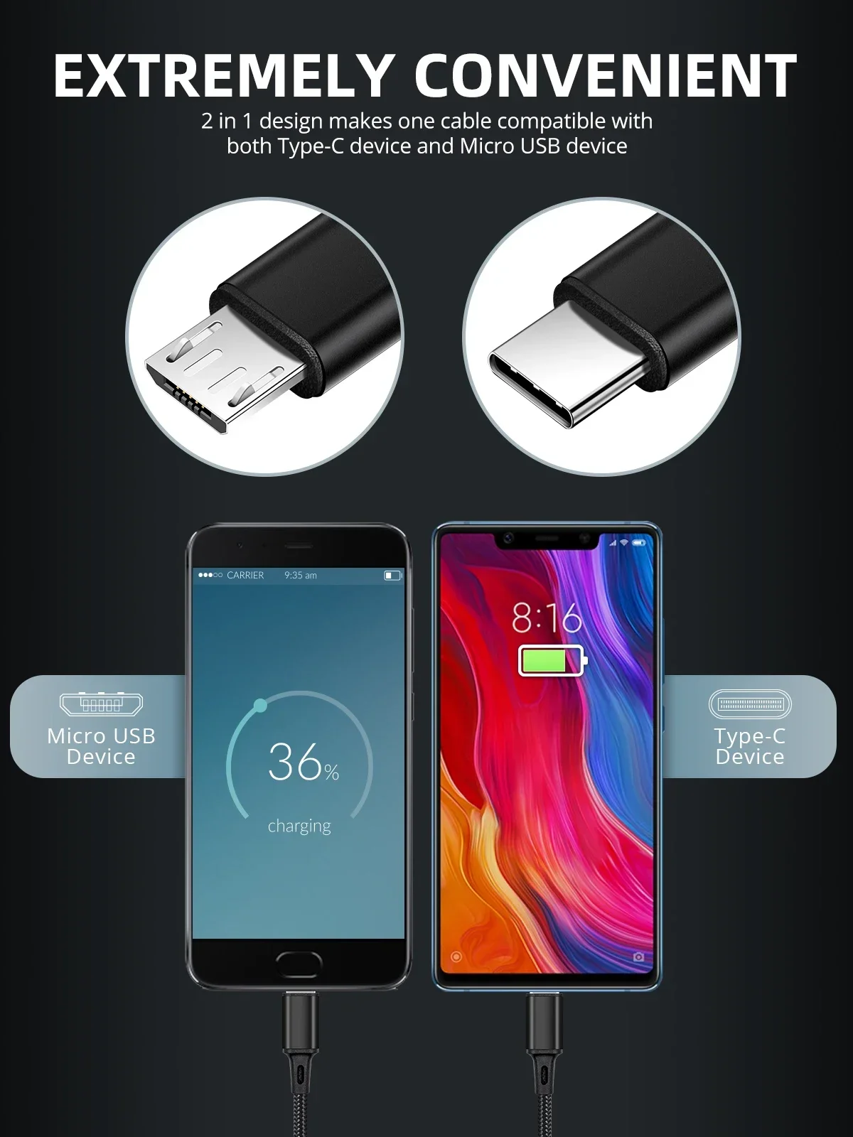Comprar Cable USB 2 en 1 de nailon trenzado para móvil y Android, Cable de carga rápida 2 en 1 Tipo C para tableta y teléfono, 1 piezas
