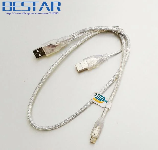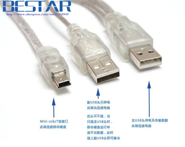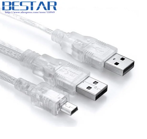 2 en 1 Transparente Doble USB 2,0 tipo A macho con fuente de alimentación USB a tipo T Mini5 Mini 5P 5pin Cable macho Y divisor doble blindaje (lámina + trenzado) para cámara HDD Propietario.