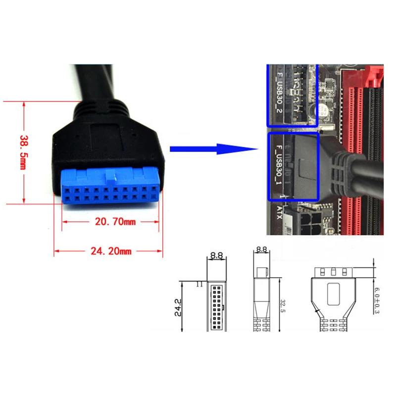 5. Cable de extensión de 19 pines hembra a doble USB3.0 macho con montaje en panel de tornillo.