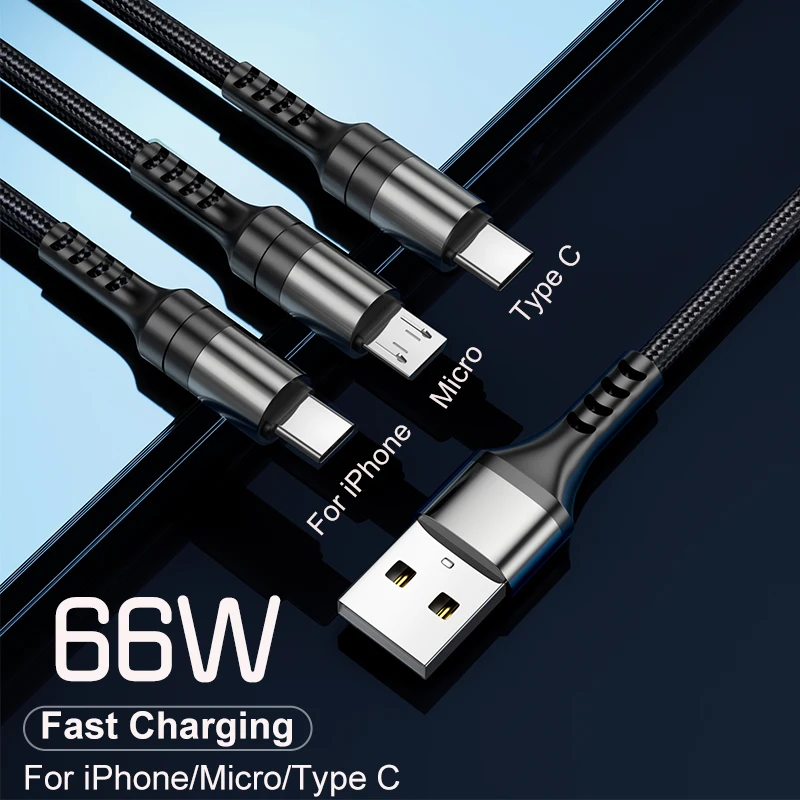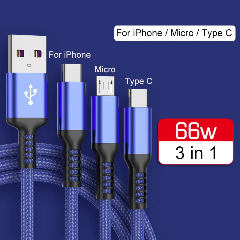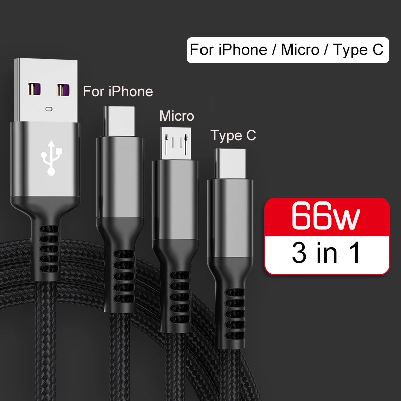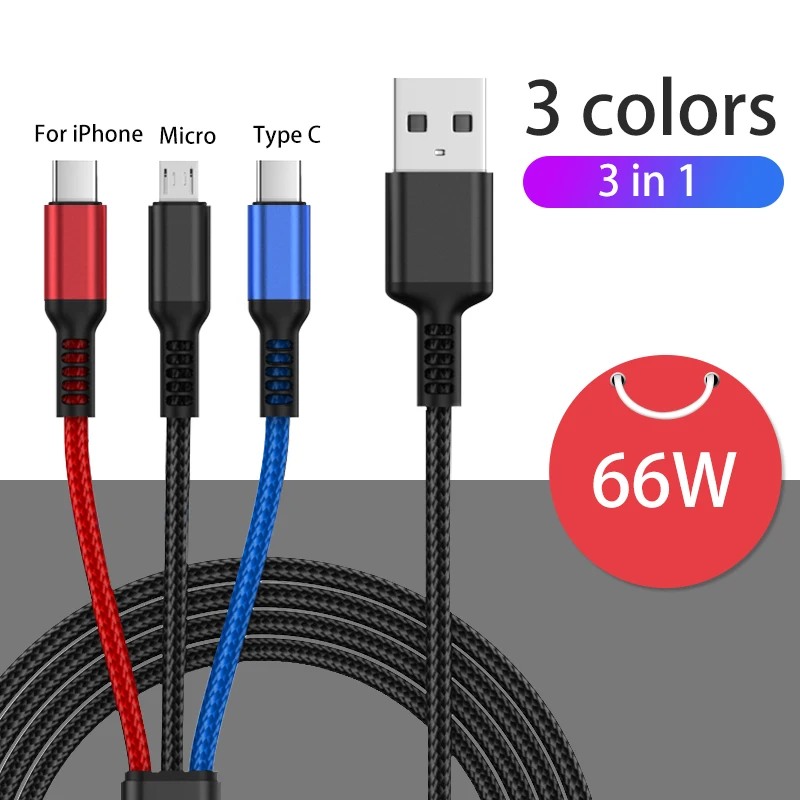 Comprar Cable USB 3 en 1 de carga rápida, accesorio de 66W para iPhone, Xiaomi, Redmi, POCO, Huawei, OPPO, Samsung