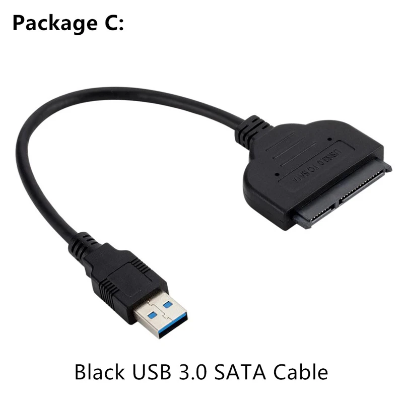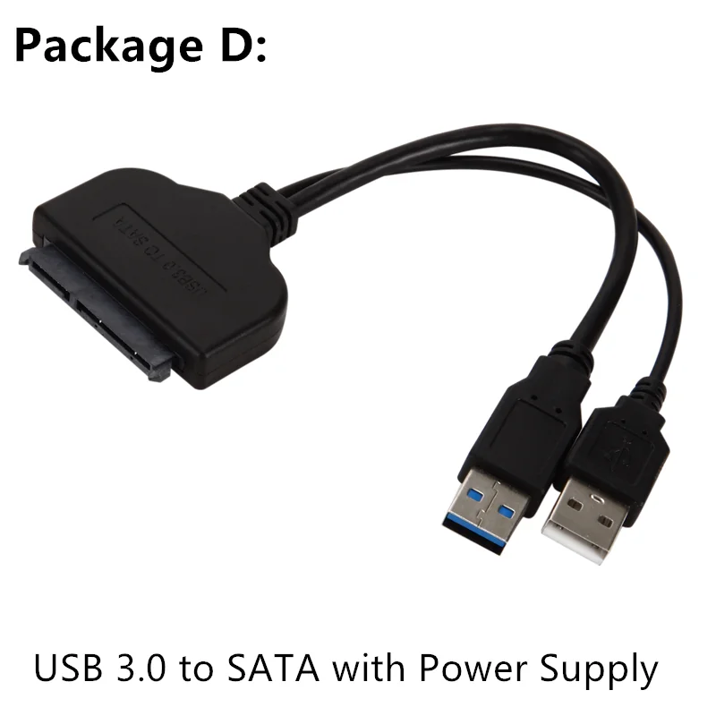 1. Adaptador SATA III USB 3,0/2,0 Cable de disco duro externo USB a Serial ATA convertidor de 22pin disco duro para HDD/SSD de 2,5 ". 2. Este convertidor Cable USB 3,0/2,0 a SATA conecta cualquier disco duro SATA estándar de 2,5 pulgadas o unidad de estado sólido (SSD) a un ordenador a través de puertos USB 3,0. Es ideal para hacer una copia de seguridad de archivos o actualizar el controlador duro de su portátil. 3. La especificación SATA 3 admite velocidad de hasta 6Gbps; 4. Acceso fácil y rápido al almacenamiento externo; 5. Indicador de actividad LED; 6. Totalmente compatible con USB 3,0/USB 2,0; Y USB 3,0 retrocompatible con USB 2,0/1,1; 7. Plug and play, intercambio en caliente; 8 Apoyo Windows 98/2000/XP/Vista/7/8 Mac OS X 9. Nota: solo disponible para disco duro portátil y SSD,no disponible para disco duro de escritorio de 3,5 pulgadas. El paquete incluye: Paquete A:1 * cable usb 2,0 sata con fuente de alimentación Paquete B:1 * azul USB 3,0 sata cable Paquete C:1 * negro USB 3,0 sata cable Paquete D:1 * Cable USB 3,0 SATA con fuente de alimentación