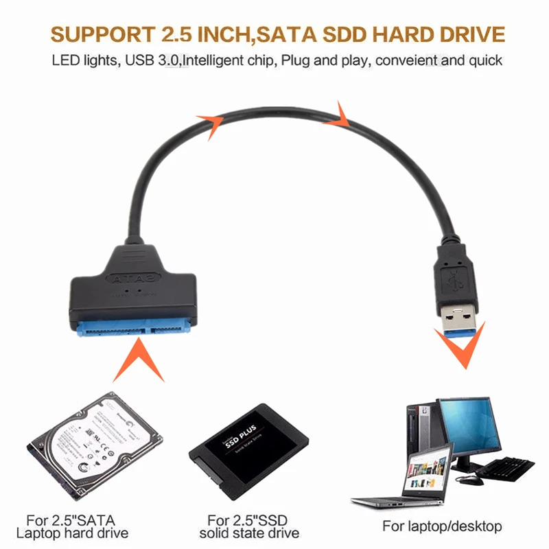 1. Adaptador SATA III USB 3,0/2,0 Cable de disco duro externo USB a Serial ATA convertidor de 22pin disco duro para HDD/SSD de 2,5 ". 2. Este convertidor Cable USB 3,0/2,0 a SATA conecta cualquier disco duro SATA estándar de 2,5 pulgadas o unidad de estado sólido (SSD) a un ordenador a través de puertos USB 3,0. Es ideal para hacer una copia de seguridad de archivos o actualizar el controlador duro de su portátil. 3. La especificación SATA 3 admite velocidad de hasta 6Gbps; 4. Acceso fácil y rápido al almacenamiento externo; 5. Indicador de actividad LED; 6. Totalmente compatible con USB 3,0/USB 2,0; Y USB 3,0 retrocompatible con USB 2,0/1,1; 7. Plug and play, intercambio en caliente; 8 Apoyo Windows 98/2000/XP/Vista/7/8 Mac OS X 9. Nota: solo disponible para disco duro portátil y SSD,no disponible para disco duro de escritorio de 3,5 pulgadas. El paquete incluye: Paquete A:1 * cable usb 2,0 sata con fuente de alimentación Paquete B:1 * azul USB 3,0 sata cable Paquete C:1 * negro USB 3,0 sata cable Paquete D:1 * Cable USB 3,0 SATA con fuente de alimentación