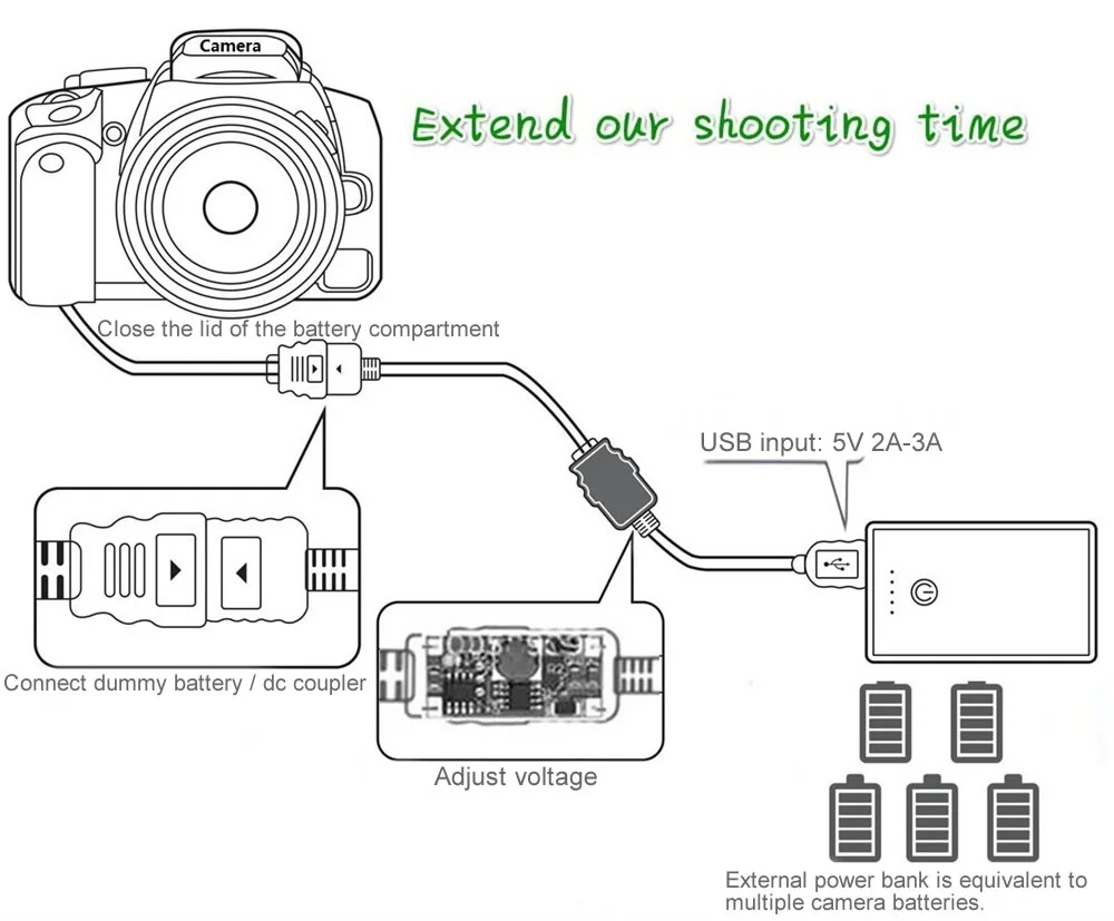 4. Cable de unidad CC conectado a la fuente de banco de energía para cámaras digitales, capacidad del banco de energía: 8000-30000 mAh, igual a la batería nueva en la alimentación de la cámara muchas veces; cuando enciende el flash para tomar fotografías o videos, para proporcionar un suministro de energía ininterrumpido.