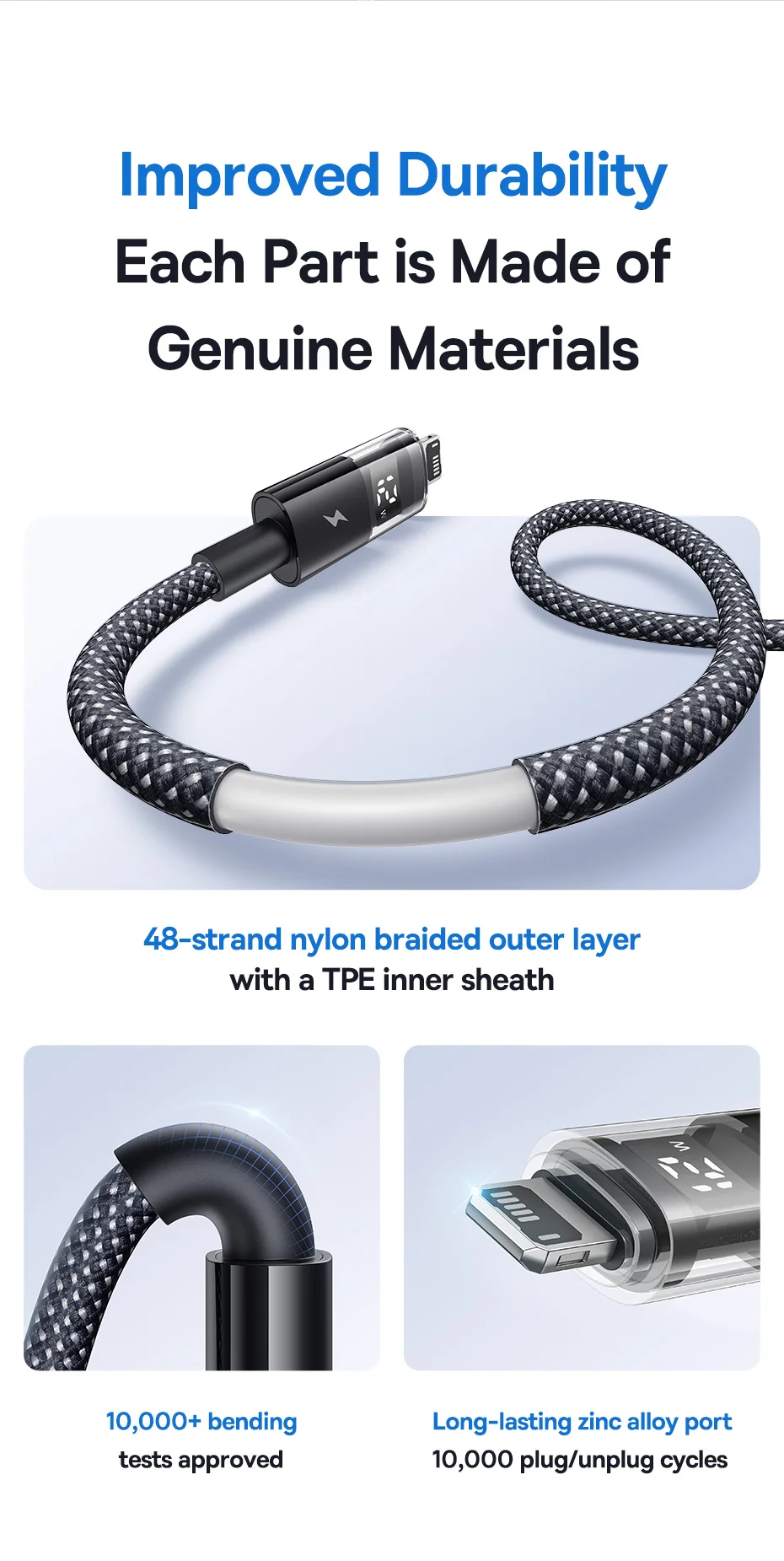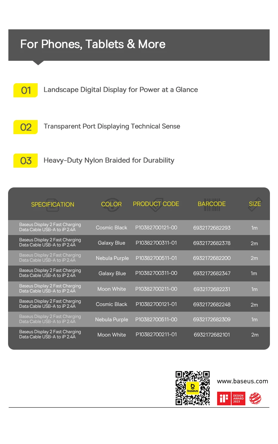 Baseus Display 2 Cable de datos de carga rápida, USB-A a Lightning 2.4A