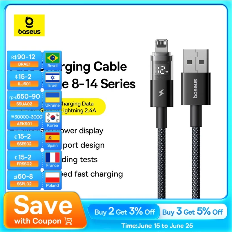 Comprar Cable USB Baseus 2.4A para iPhone 14 13 12 Cable USB con pantalla LED para iPad Pro Cable de datos de carga rápida para iPhone 7 6S