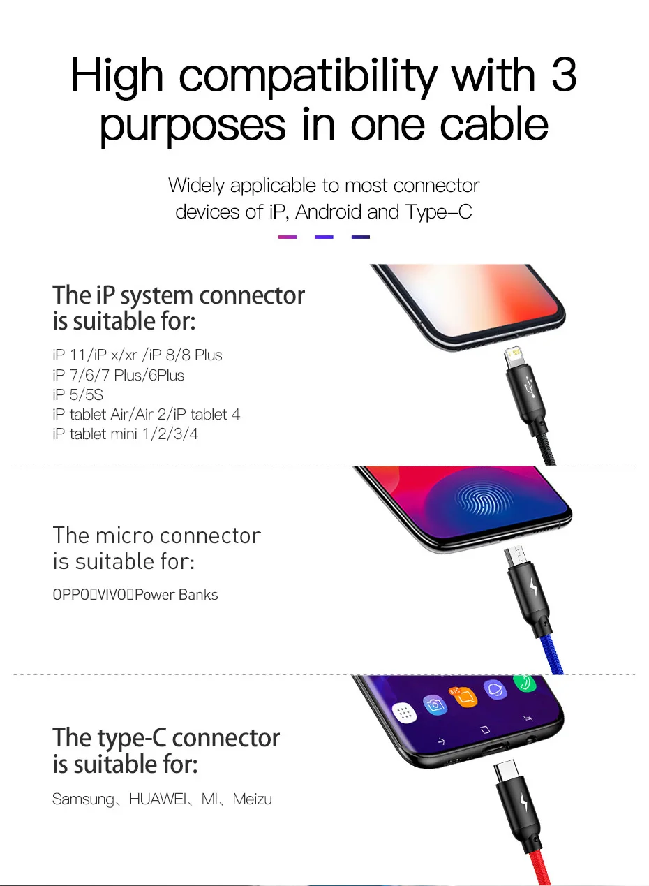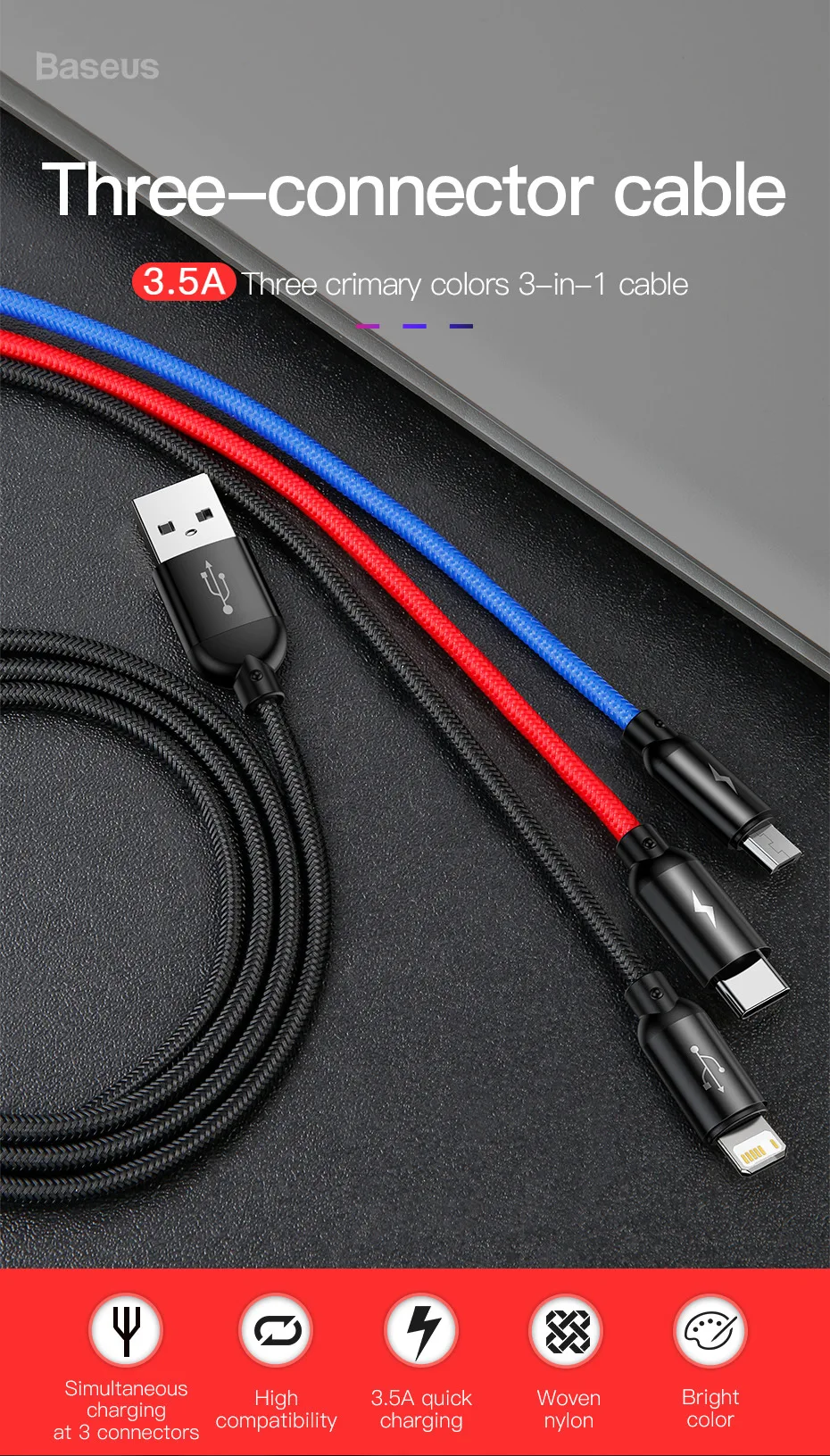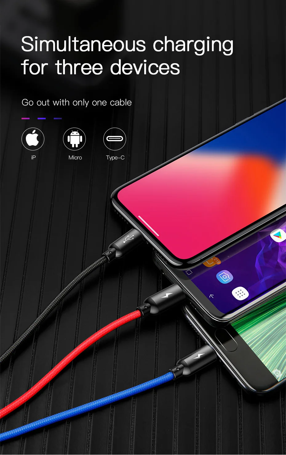 Comprar Cable USB Baseus 3 en 1 tipo C para Samsung Xiaomi Mi Cable 4 en 1 para iPhone 14 13 12X11 Pro Max cargador Cable Micro USB