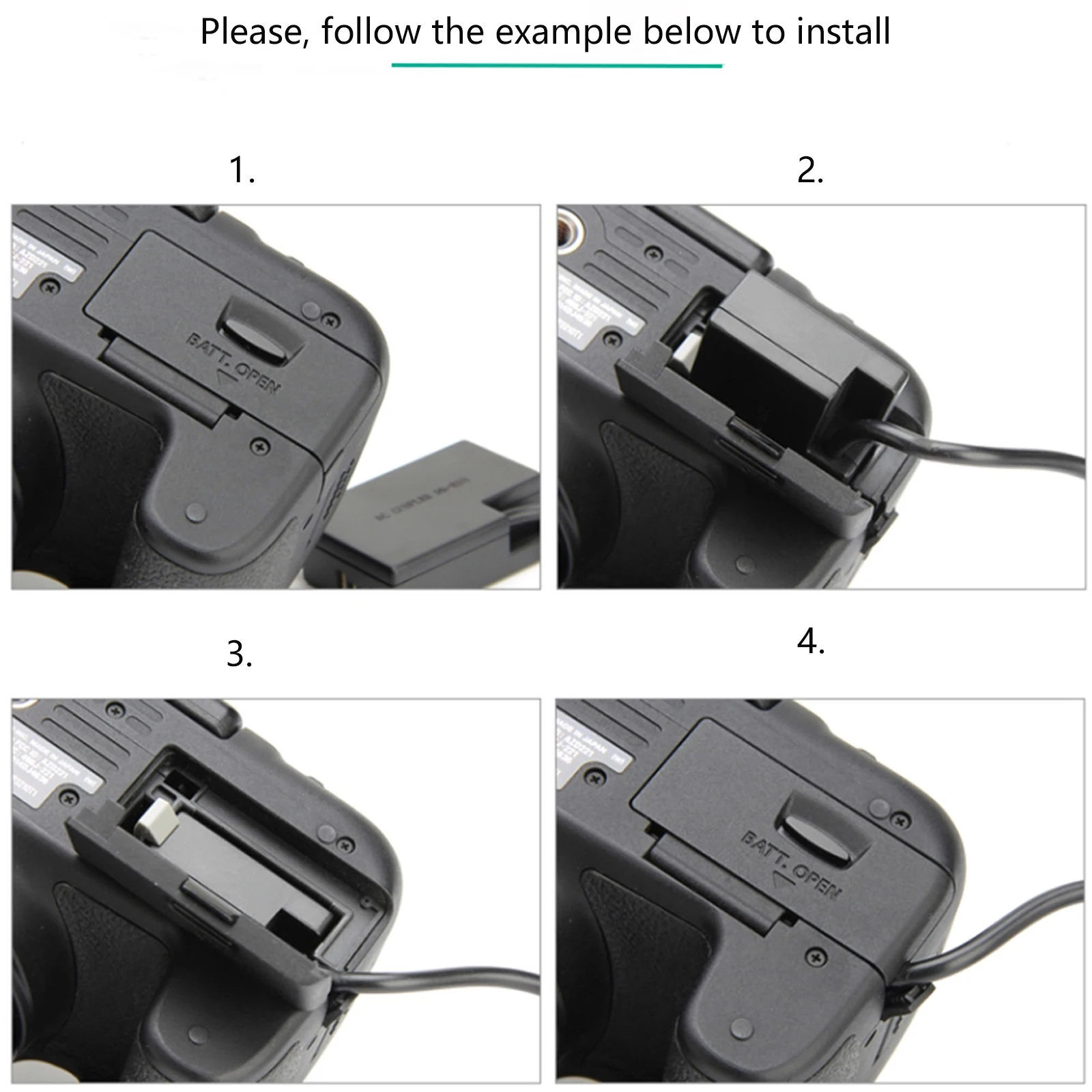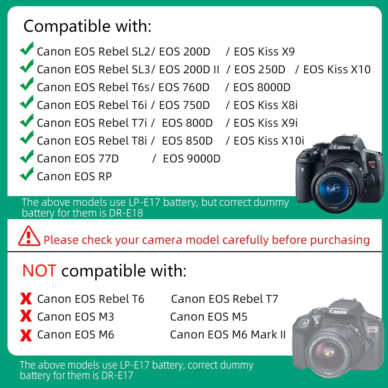 Kit PD ACK-E18:Chips de alta calidad, convertidor DC-DC, alta eficiencia de conversión, buena estabilidad, la corriente central es pequeña,al mismo tiempo que sirve para suprimir eficazmente el ruido de la corriente armónica. Utiliza un amplio rango, adecuado para la mayoría de 7,2 V-8,4 V.y cámara de 9V.Protección contra sobretensión, Protección contra sobrecorriente, Protección contra sobrepotencia, Protección contra sobrecalentamiento, Protección contra cortocircuitos.No hay necesidad de preocuparse por explosiones de incendios o golpes que se produzcan.Después de conectarse al adaptador de corriente o banco de energía PD y QC3.0/4.0 correcto,Ciertos modelos de cámaras pueden consumir una corriente más alta, así que utilice una fuente de alimentación de alto rendimiento.Cable USB-C:Entrada: PD 20W-65WSalida: 7,6-9V 2-3ALongitud: 2mCompatible con:Canon Rebel T6i, T7i, T8i, T6s,Canon EOS SL2, SL3,EOS RPCanon EOS 750D, 760D, 800D, 850D, 200D, 200D II, 250D, 8000D, 9000D, 77DCanon Kiss X8i, Kiss X10i, Kiss X9i, Kiss X10, Kiss X9El paquete incluye:1 cable USB-C1 acoplador CC DR-E18