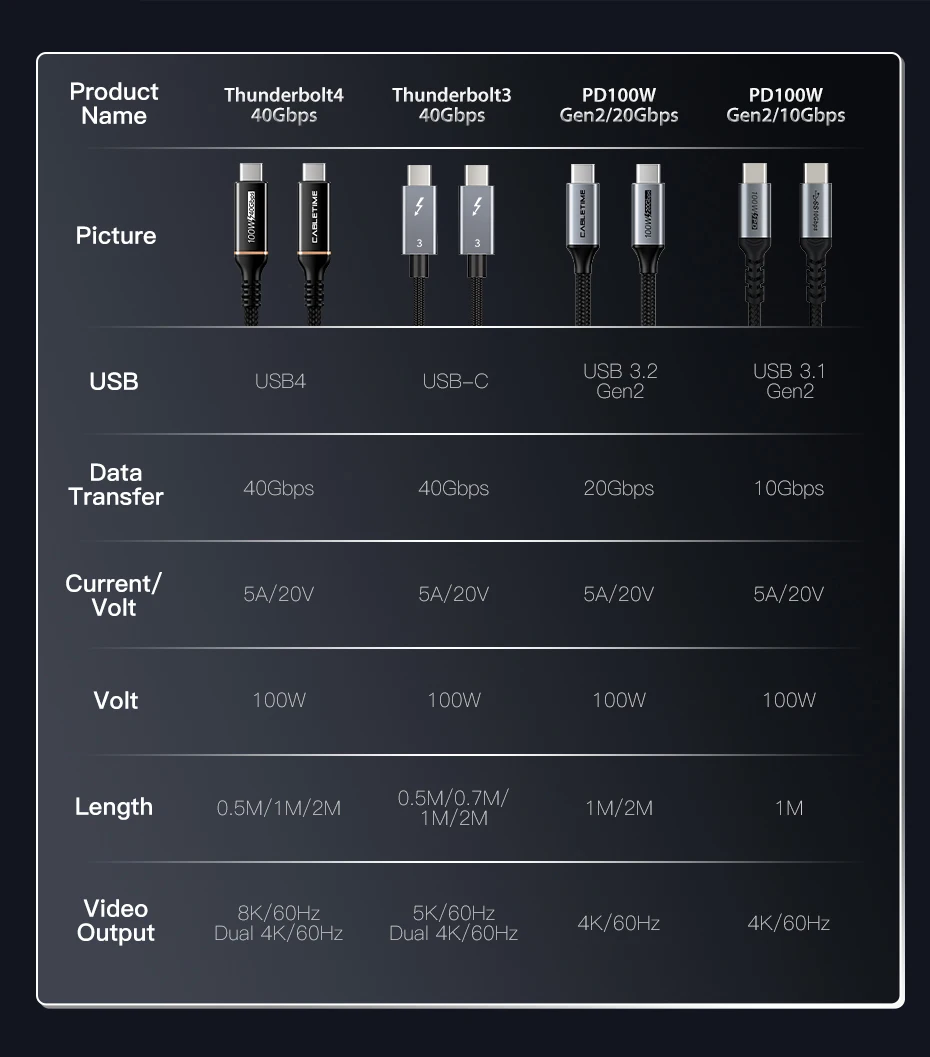 【40 Gbps y 100 W】El cable CABLETIME Thunderbolt 3 admite la transferencia de datos de hasta 40 Gbps y carga hasta 100 W, 8 veces más rápido que los cables USB-C estándar.Todo totalmente compatible con USB-C.
