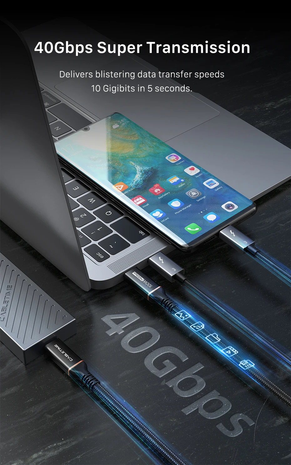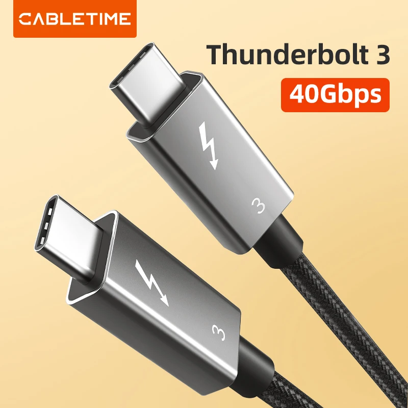 【40 Gbps y 100 W】El cable CABLETIME Thunderbolt 3 admite la transferencia de datos de hasta 40 Gbps y carga hasta 100 W, 8 veces más rápido que los cables USB-C estándar.Todo totalmente compatible con USB-C.