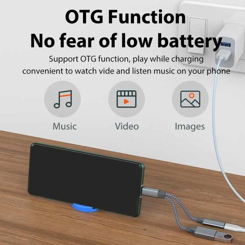 Este cable otg usb c carga su teléfono hasta 10WPD mientras transfiere datos y conecta múltiples periféricos de alimentación pequeños.