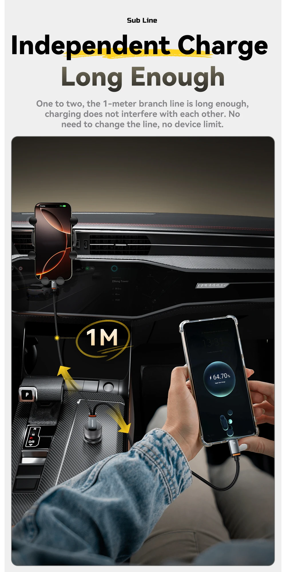 Es genial para usar en el coche porque puedes cargar dos dispositivos con un solo cable. Aún no lo he usado, pero creo que funcionará muy bien.