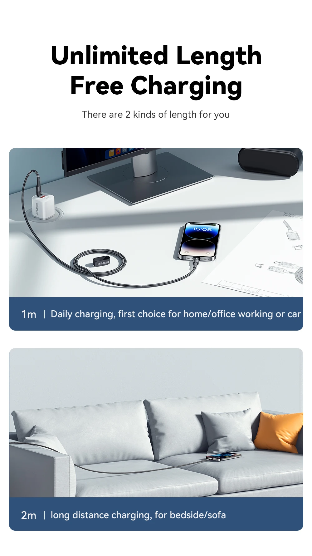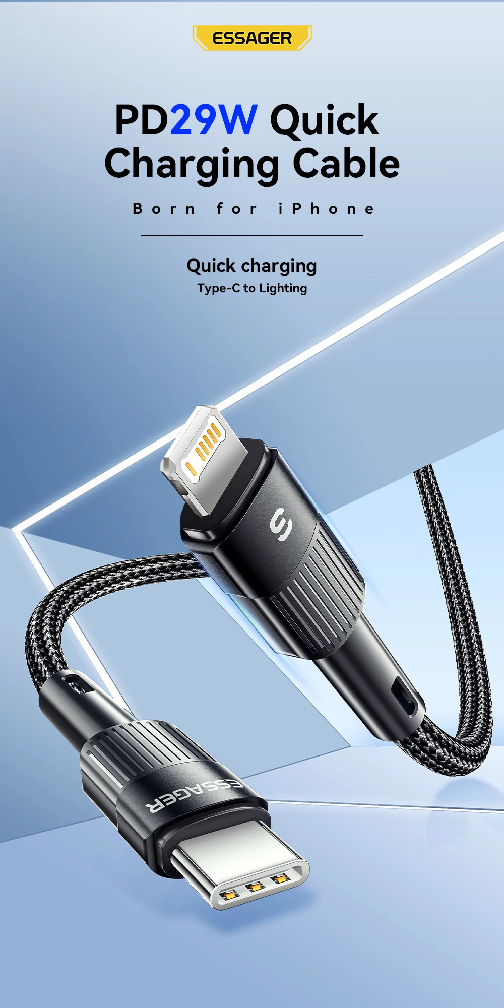 El cable ESSAGER Type-C To Lighting tiene un chip inteligente incorporado que garantiza la velocidad completa y la carga segura del teléfono, con una potencia máxima de salida de hasta 29W. Recargue rápidamente su teléfono con una carga rápida de hasta 29W PARA EL ip14 Pro Max, 30 minutos a 50% (requiere un cabezal de carga PD30W o superior).