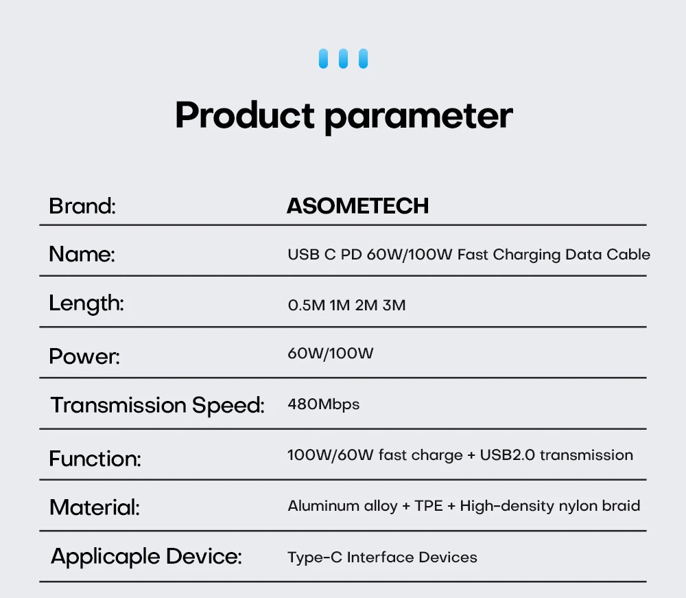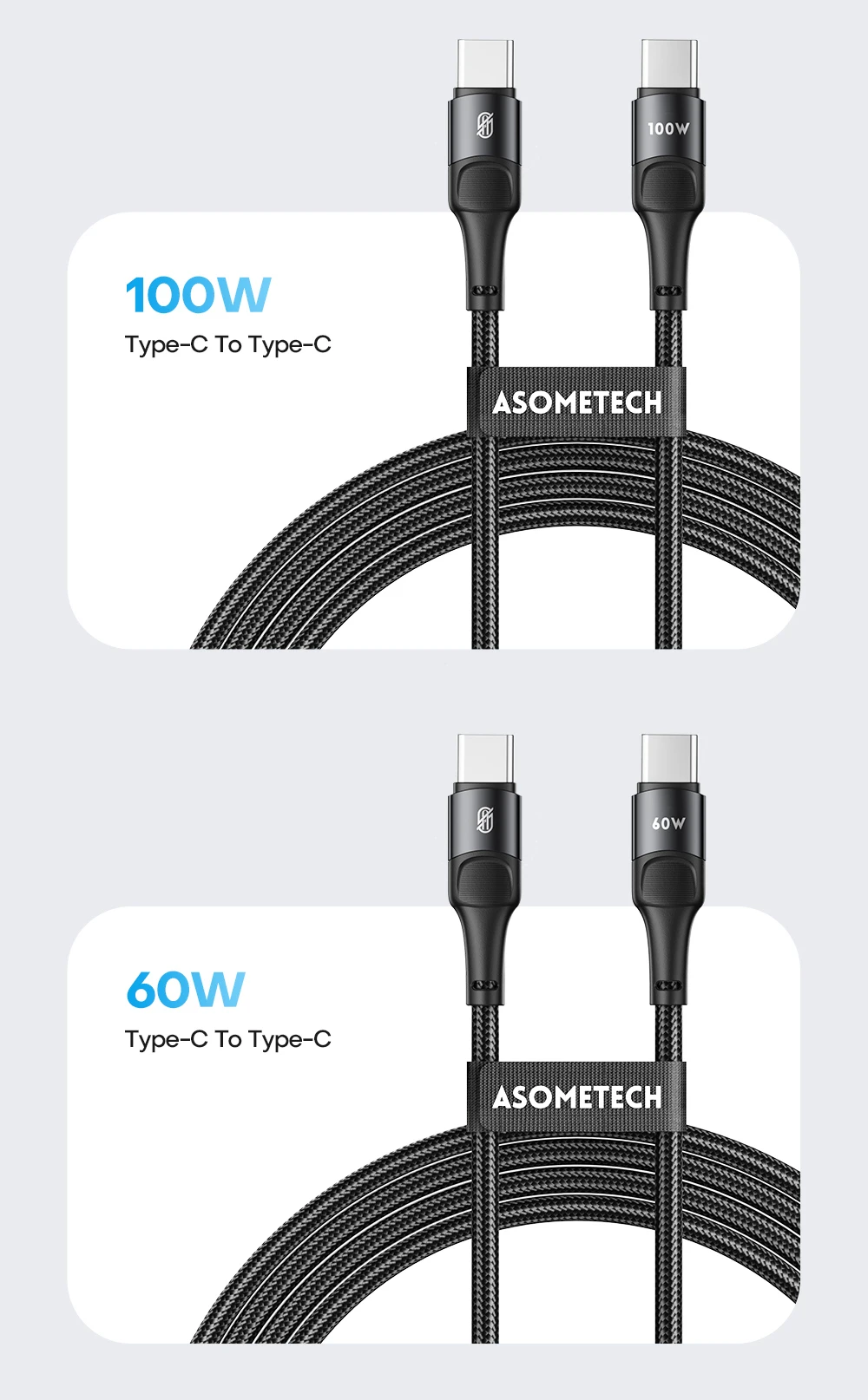 PD 100W carga rápidaASOMETECH-Cable USB C a USB tipo C, soporta carga rápida de 100W(20V/5A) ,66W(11V/6A),40W(10V/4A) carga completa Huawei Mate 30 Pro en 95 minutos, se puede utilizar para portátiles, tabletas, teléfonos.