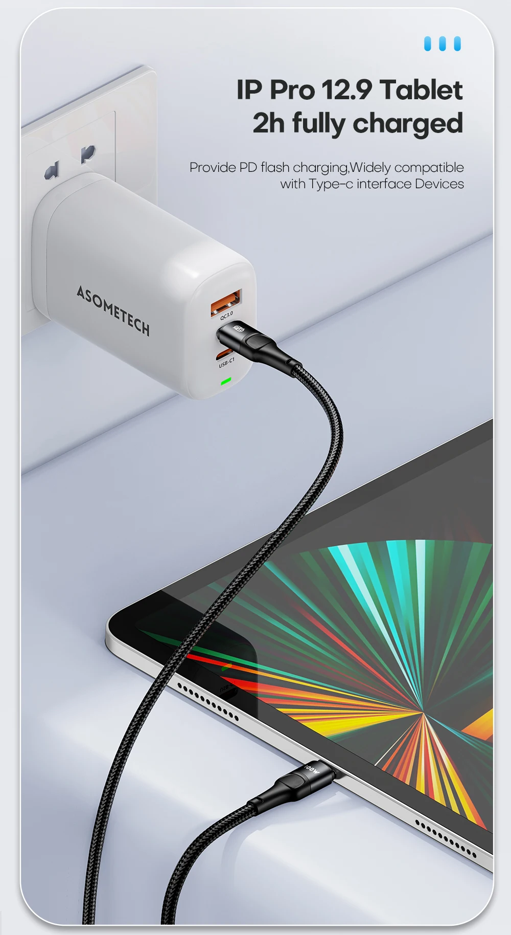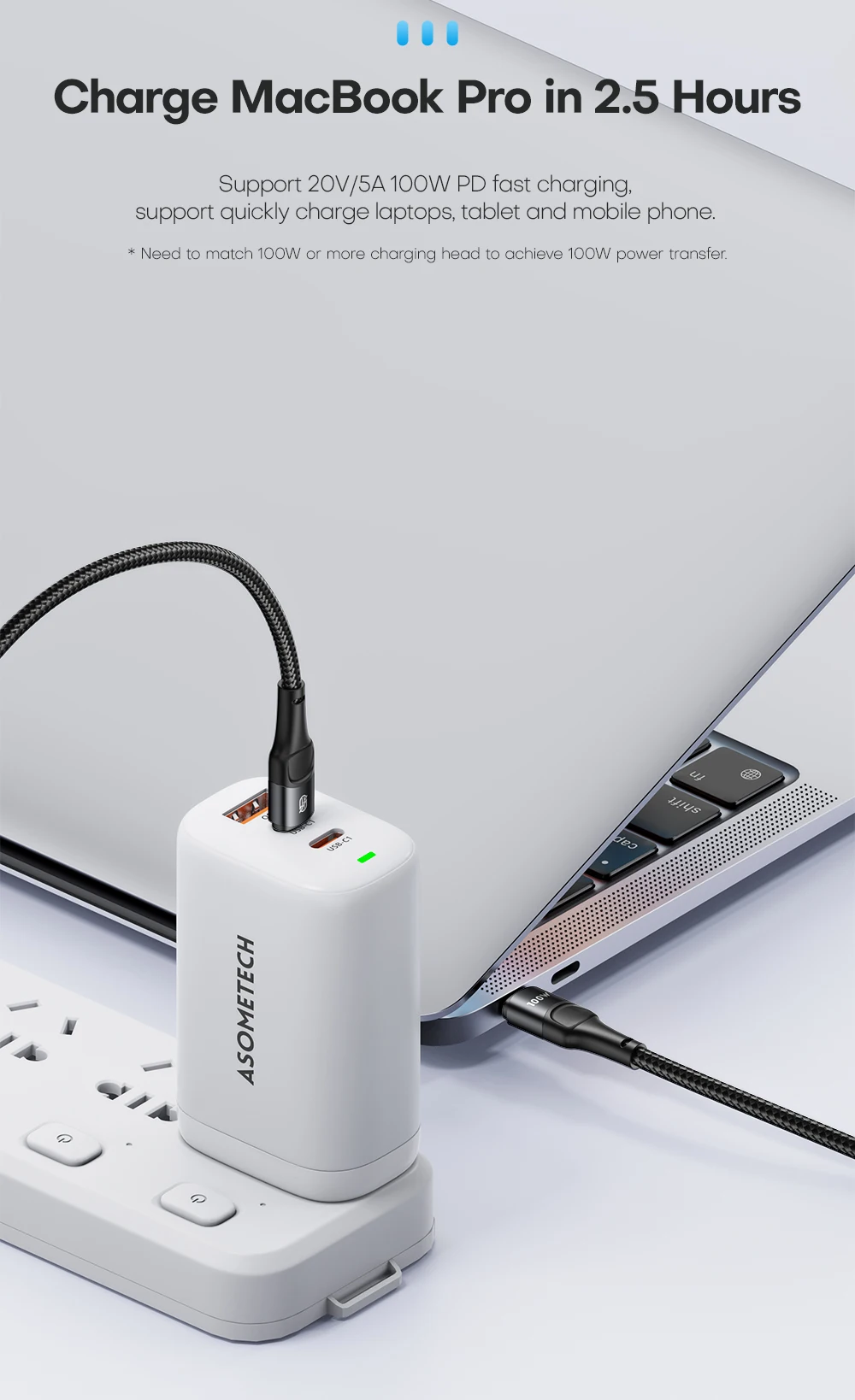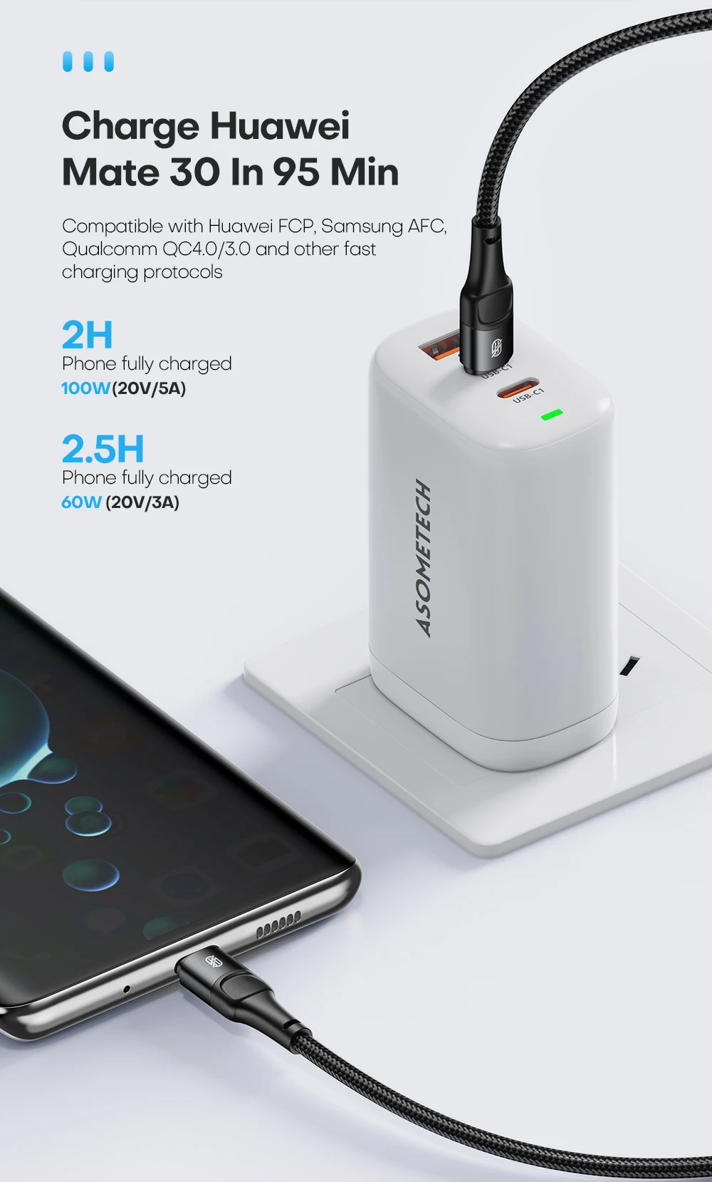 PD 100W carga rápidaASOMETECH-Cable USB C a USB tipo C, soporta carga rápida de 100W(20V/5A) ,66W(11V/6A),40W(10V/4A) carga completa Huawei Mate 30 Pro en 95 minutos, se puede utilizar para portátiles, tabletas, teléfonos.