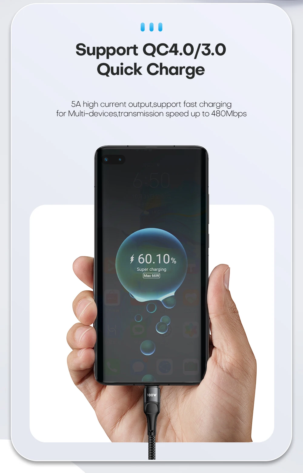 Preguntas frecuentes.P1: ¿Por qué no se puede utilizar el cable de datos para una carga rápida?R1: Nuestros cables de carga son compatibles con la mayoría de los protocolos de carga rápida, excepto por unos pocos dispositivos que no admiten carga rápida (por ejemplo, los dispositivos Xiaomi no admiten carga rápida Turbo). Si su dispositivo Compruebe lo admite antes de comprar. Si no está seguro, póngase en contacto con nuestro servicio de atención al cliente.