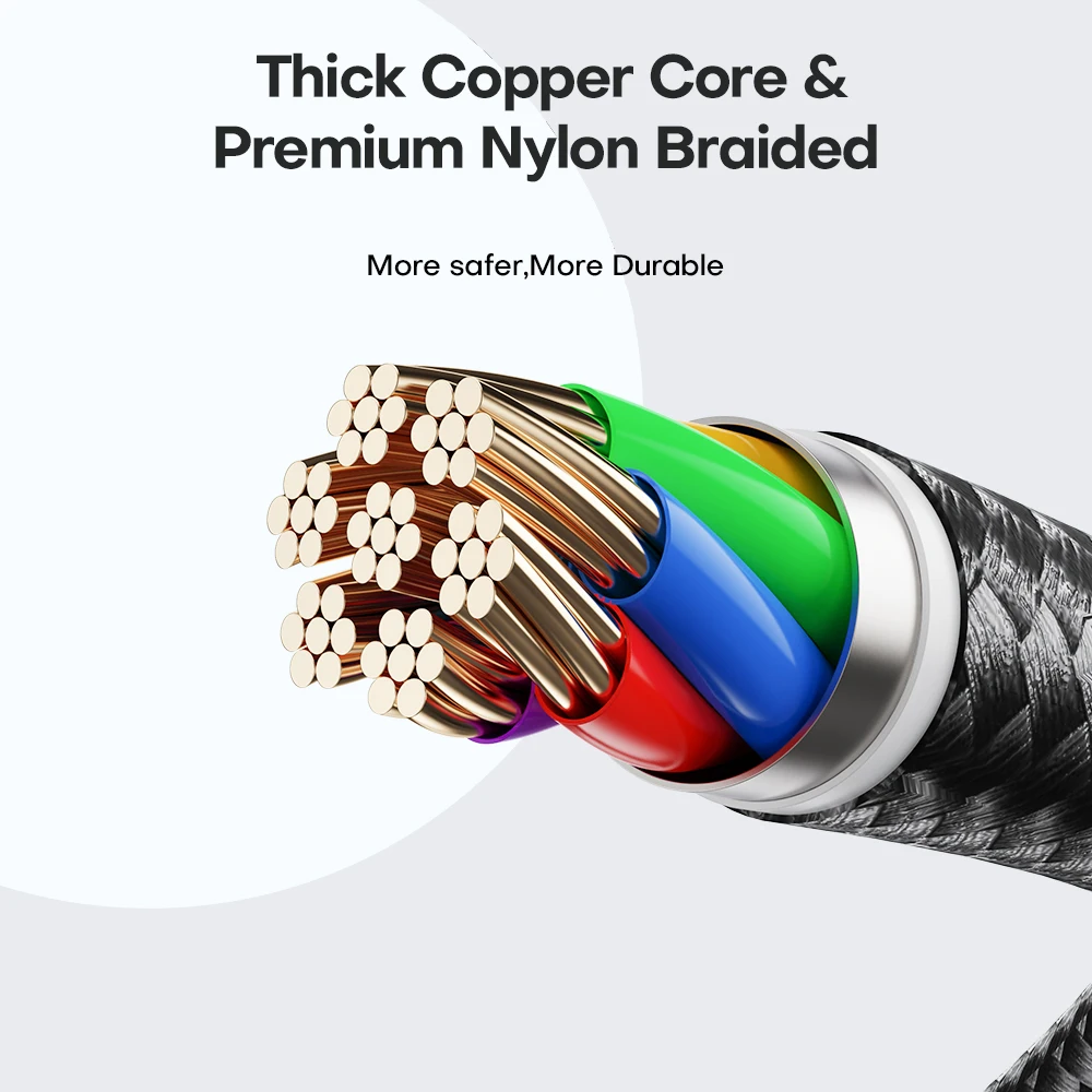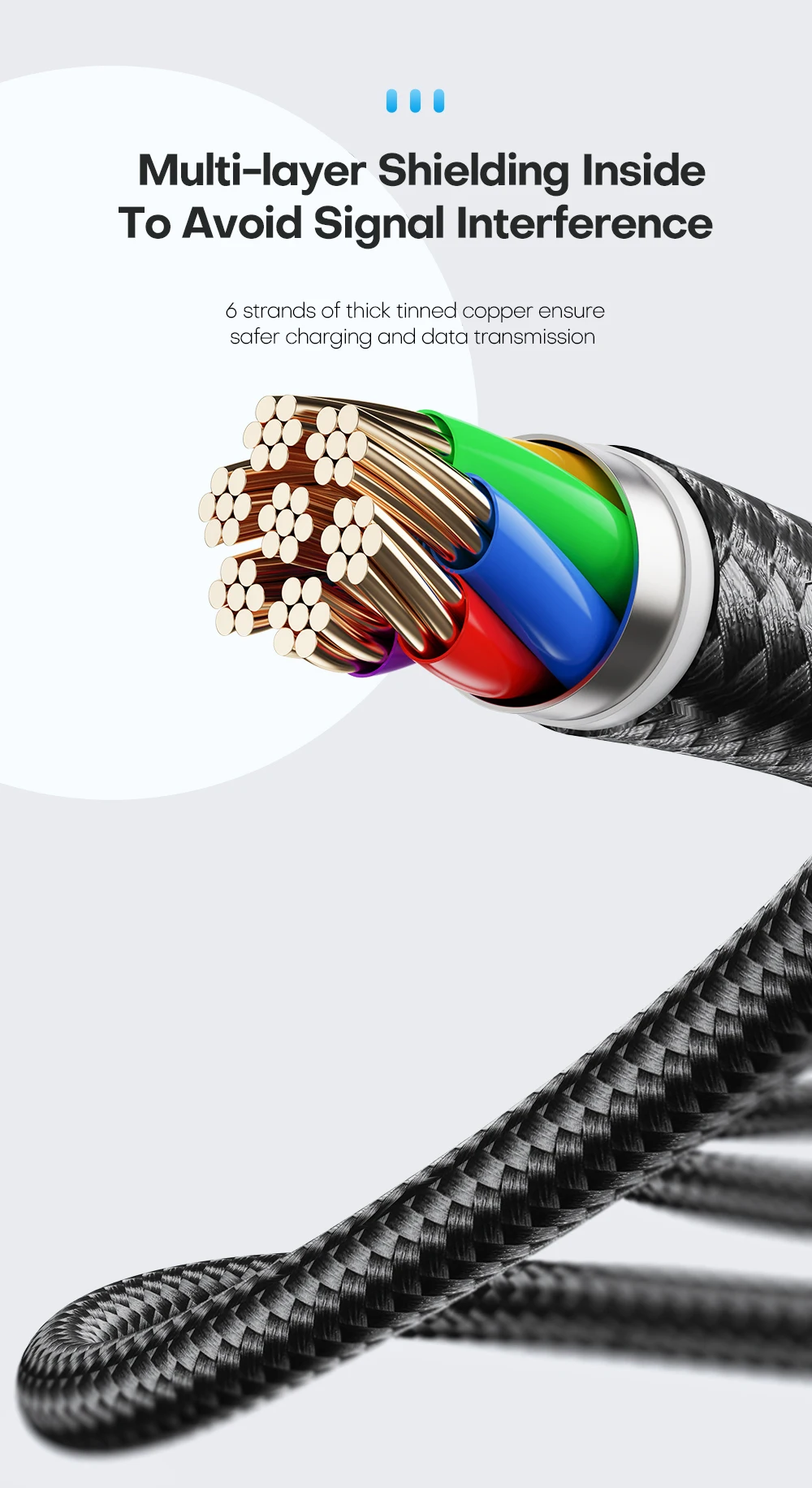 6 hebras de cobre estañado grueso que garantizan una carga y transmisión de datos más seguras