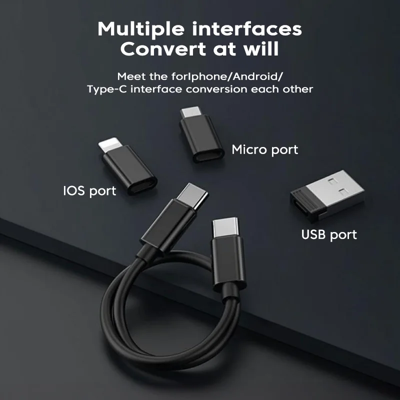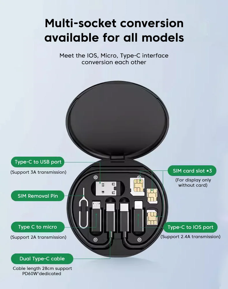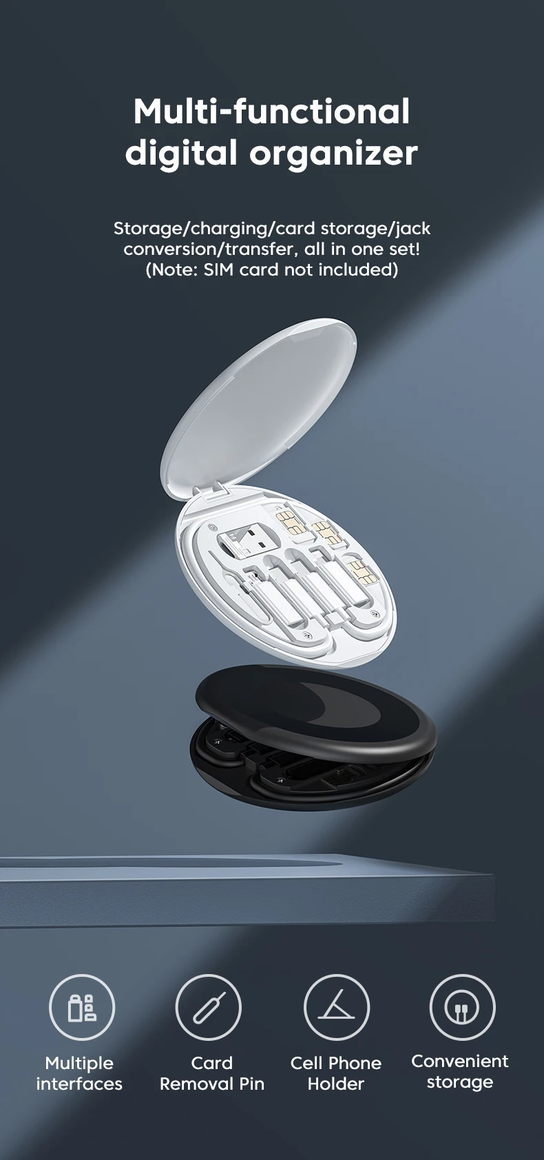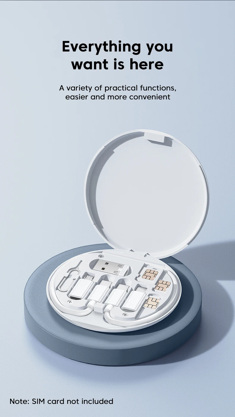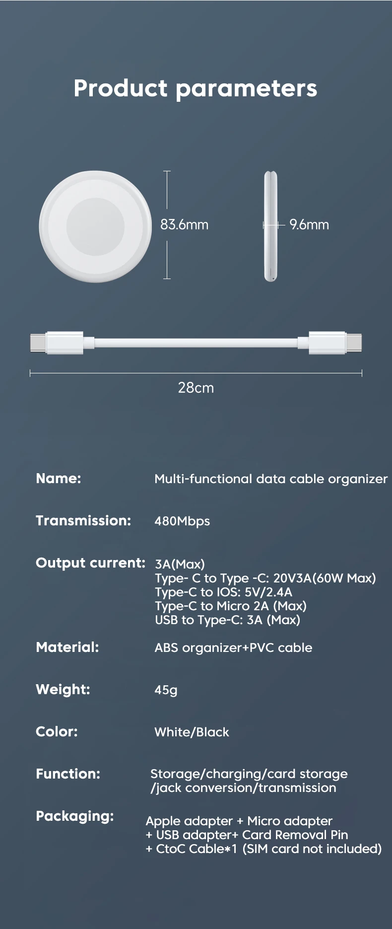 Nombre:Organizador de cables de datos multifuncionalTransmisión: 480MbpsCorriente de salida: 3A(Max)Tipo-C a Tipo-C: 20V3A(60W máx.)Tipo-C a IOS:5V/2.4ATipo-C a Micro 2A (máx.)USB a tipo C:3A (máx.)Material: organizador ABS + Cable de PVCPeso: 45gColor: Blanco/negro/azulFunción: almacenamiento/carga/Almacenamiento de tarjetas/conversión Jack/transmisiónEmbalaje:Adaptador Apple + Micro adaptador+ Adaptador USB + PIN de extracción de tarjeta+ Cable CtoC * 1 (tarjeta SIM no incluida)