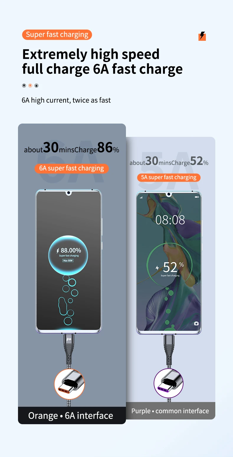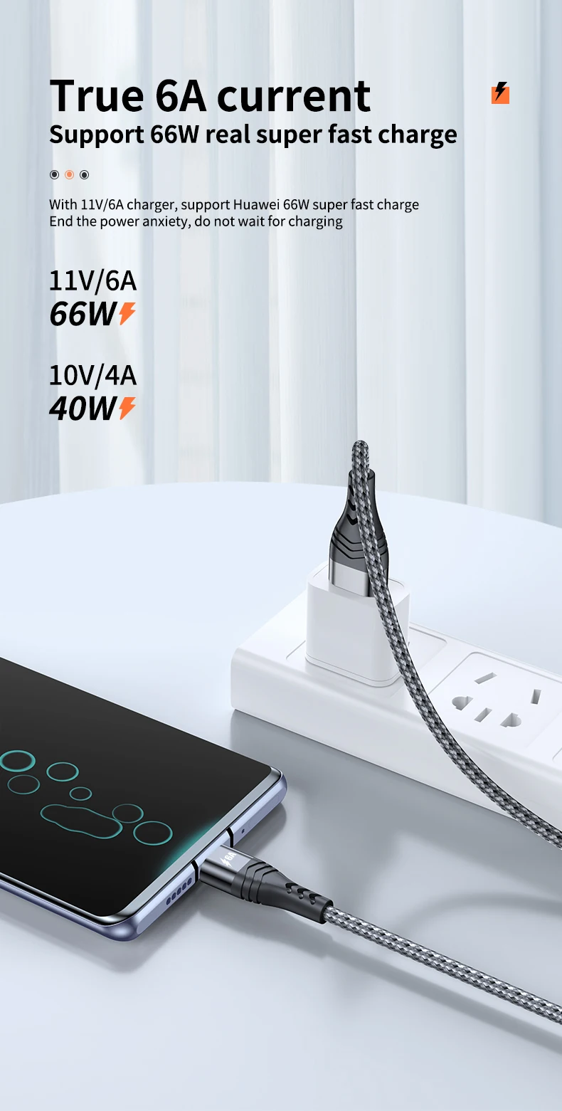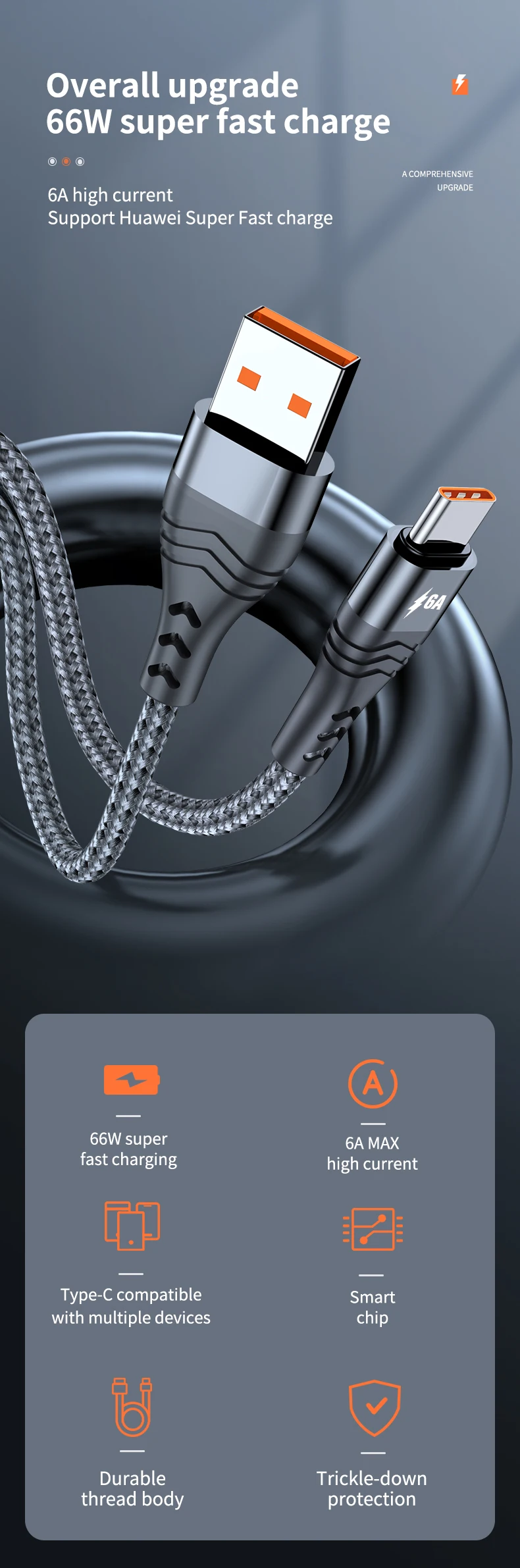Comprar Cable USB tipo C de carga rápida, 6A, 66W, Cable de datos 6A, cables de cargador USB C para Samsung S21, Xiaomi, Huawei P40 Pro, 3M, 2M, 1M