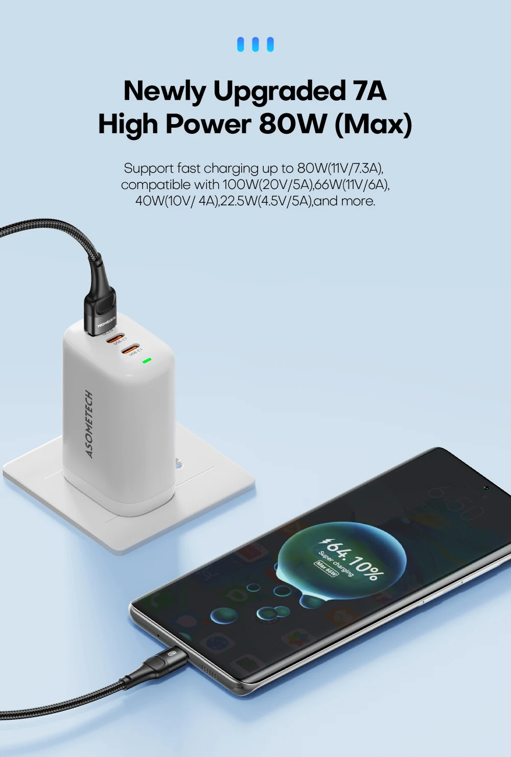 El cable USB A a USB C de ASOMETECH tiene un chip inteligente incorporado, que garantiza una carga segura de hasta 80W (11V/7.3A) de salida de potencia para su teléfono a toda velocidad.Sincronización rápida de datos de 480MbpsPotente y duradero Compatible100W (20V/5A) carga rápida máximaAdecuado para Huawei Nava 9 Pro , Nava 10 Pro
