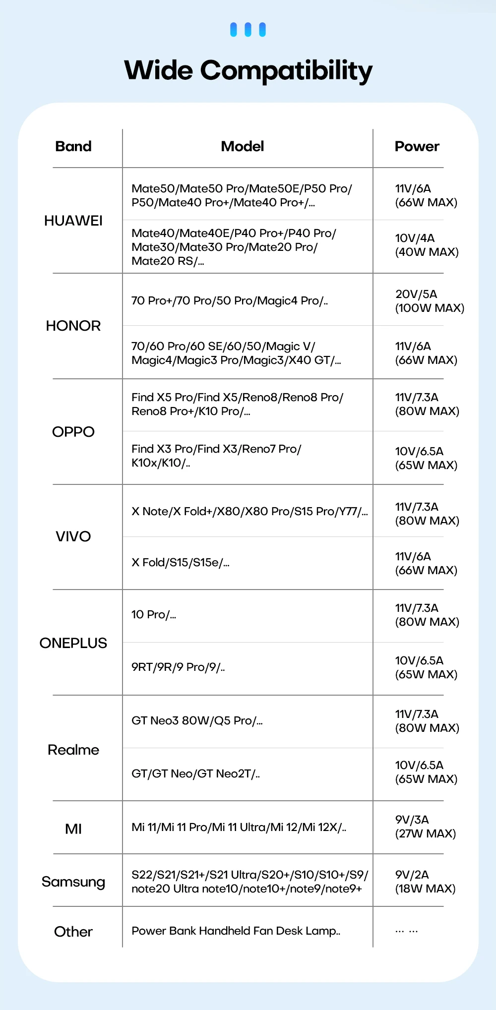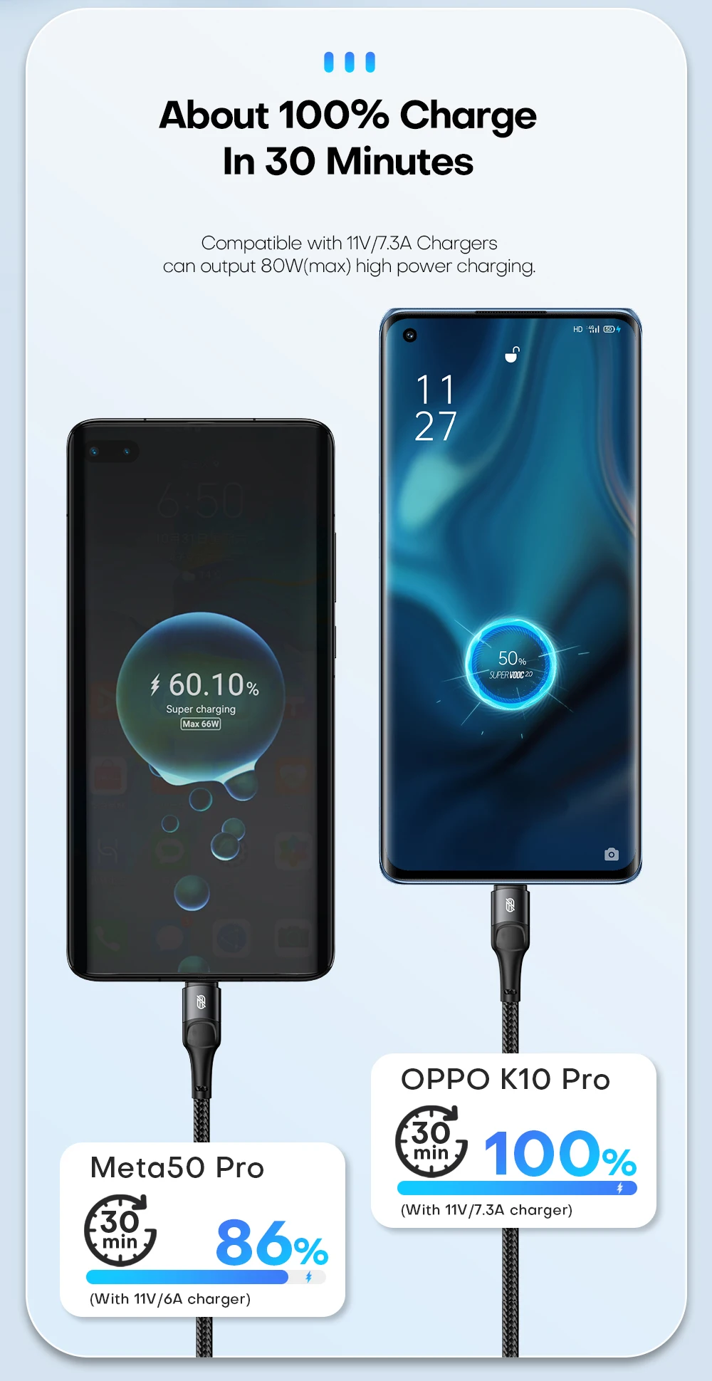 Carga rápida máxima de 65W (10V/6,5 A)Para los teléfonos de la serie OPPO / Oneplus/, son compatibles con el Protocolo de carga rápida VOOC.
