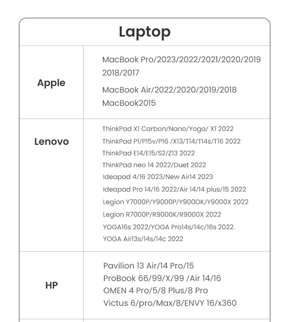 iPhone 15 Series/Apple MacBook Pro (2016 and later)/ iMac (2017 and later)/MacBook Air (2018 and later)/iPad Pro (2021 and later)/Mac Studio/Mac Pro/Surface Book 2/3, Surface Laptop 3, /Dell XPS 15/13/HP Chromebook x360/Samsung Galaxy S23/S22/S21/S20/S10/S9/S8/ Note 20/10/9/8, LG V40, Steam Deck, and more.