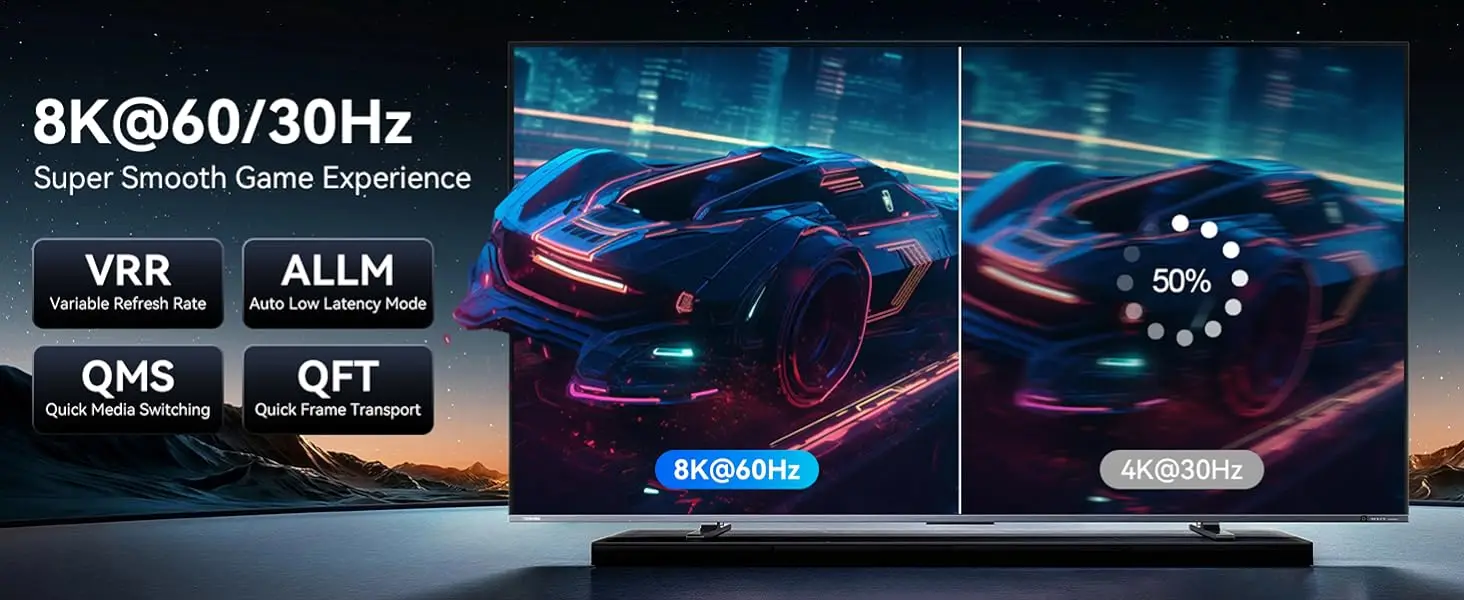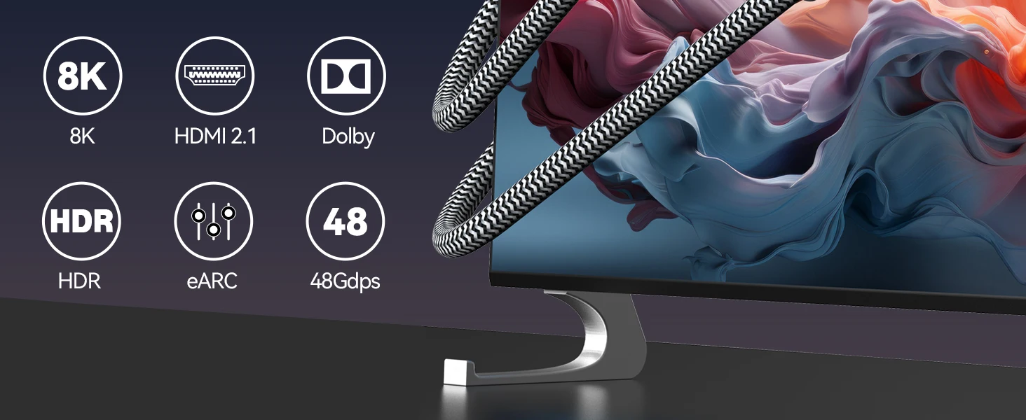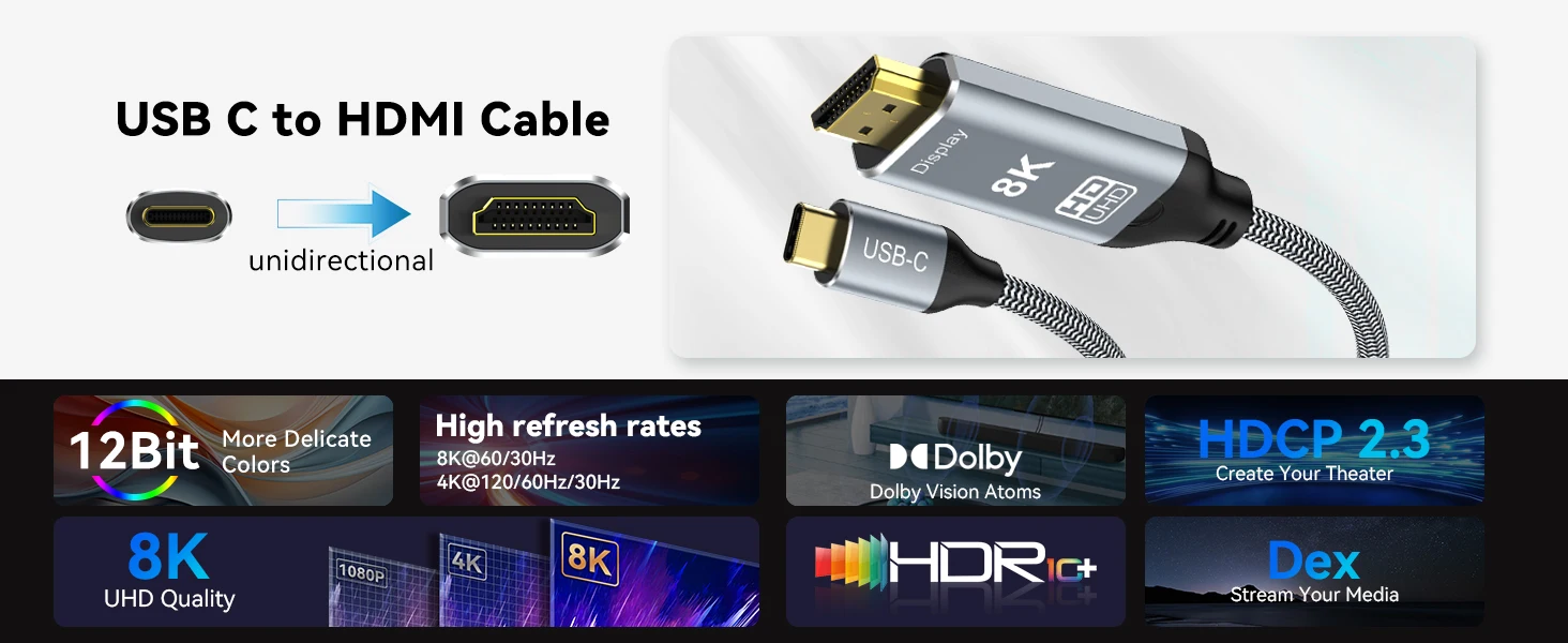 8K USB C to HDMI 2.1 Cable combines the latest HDMI 2.1 standard with the versatility of USB-C. Supports 8K@30Hz, 4K@120Hz, 2K@144Hz high refresh rate and 48Gbps bandwidth. Rejection screendelay and flicker. Dynamic HDR delivers realistic visual effects with rich colors and super-fine details .Upgrade eARC audio-visual feast for surround sound audio,build the home theater system. Just plug and play, no additional driver/software required.
