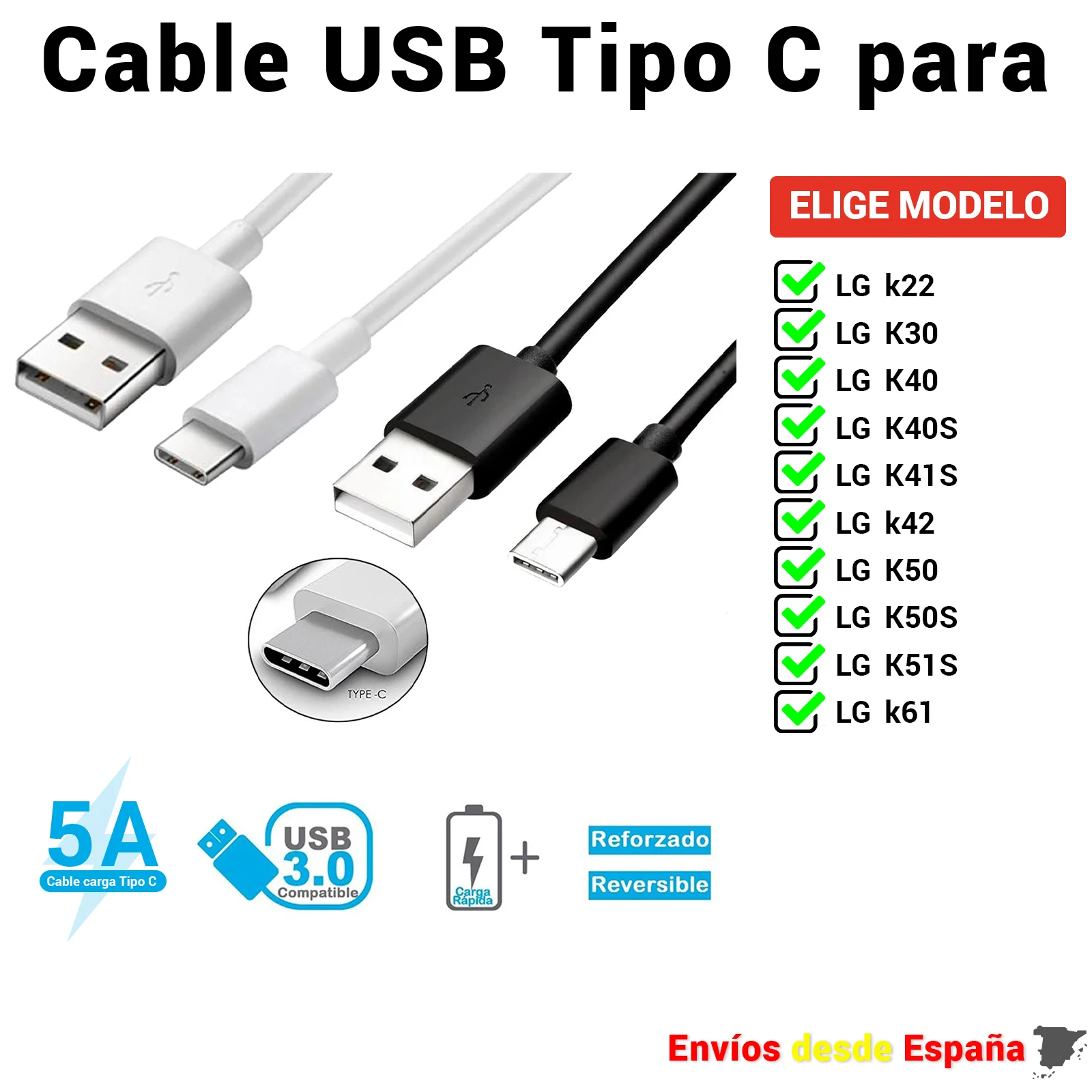 Comprar Cable USB Tipo C para LG k22 K30 K40 K40S K41S k42 K50 K50S K51S k61 de Carga rapida y Datos para móviles de 1 metro y 2 metros