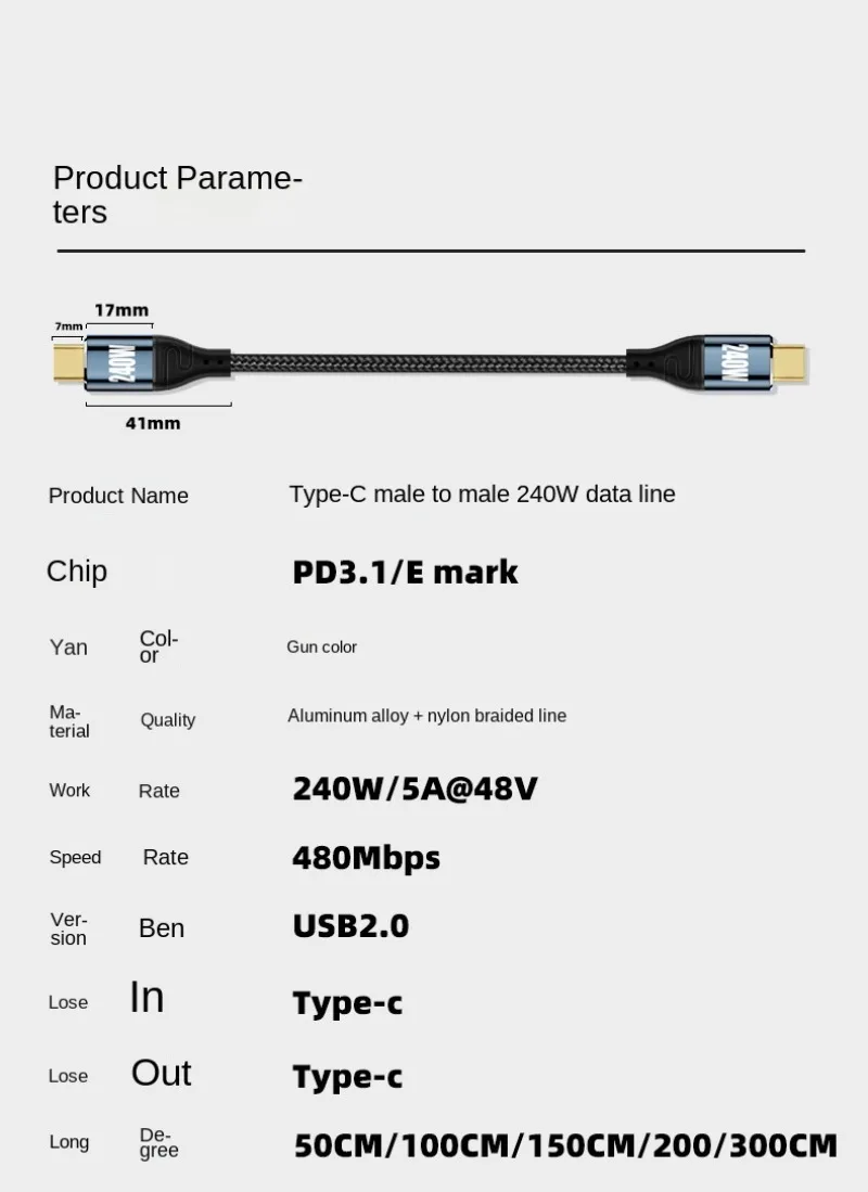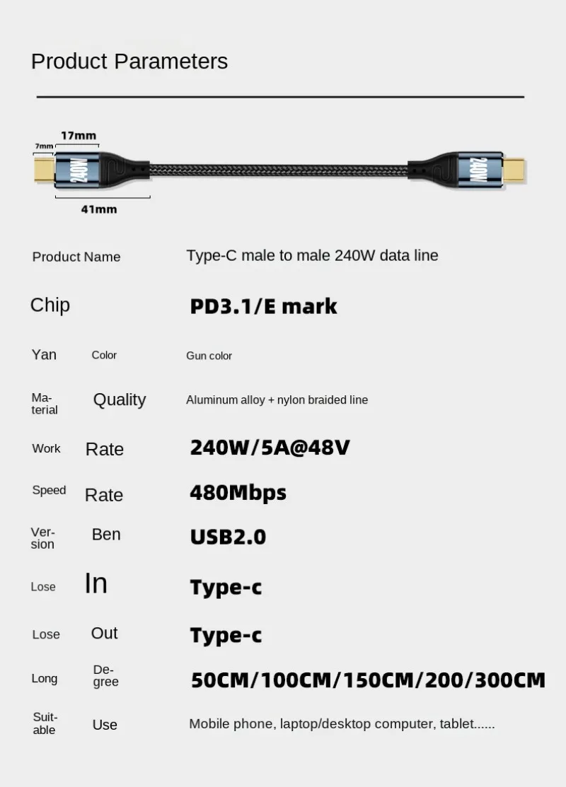 Descripción:PD3.1 240W USB Tipo C Cable Línea de alimentación para PS5 Nintendo Switch Galaxy S22 MacBook Blazing-Cable de carga rápida 48V5A USB C CableColor: negro,Longitud: 0,5/1m/1,5 m/2M/3mMaterial del alambre: carcasa de metal + Transmisión de malla tejidaVersión: 240WFunción: función PD Transmisión de datos de carga (480Mbps)Lista: cable PD tipo C * 1