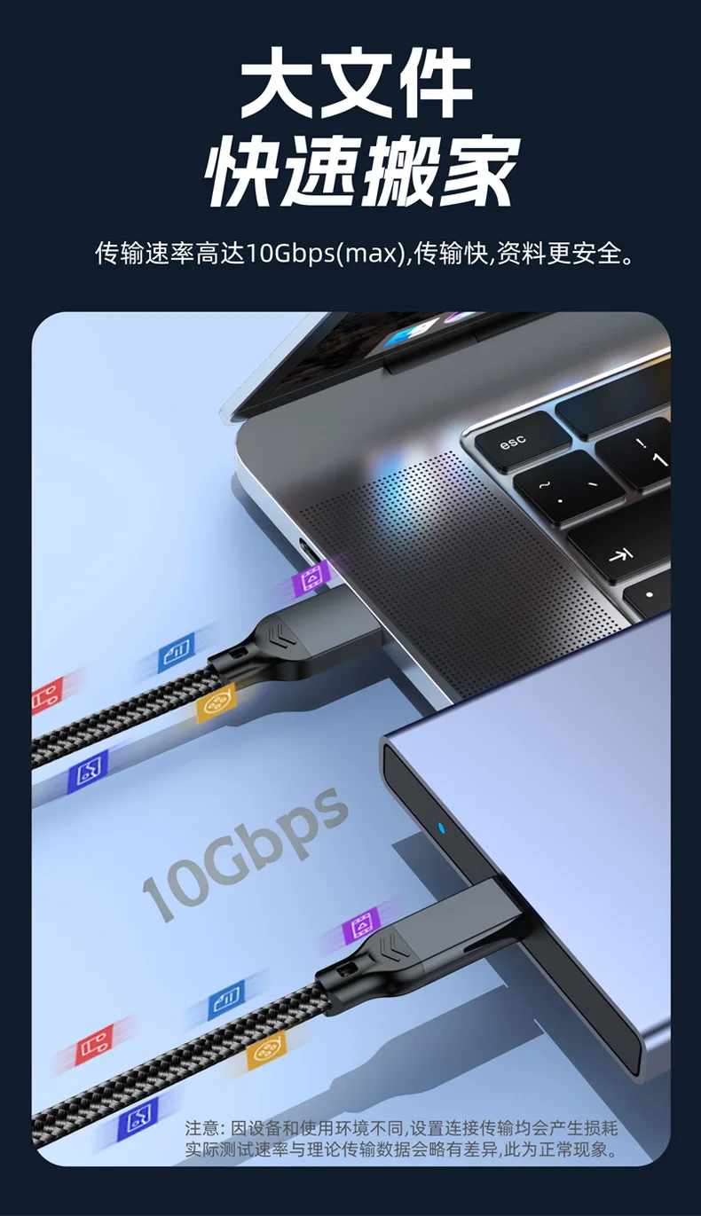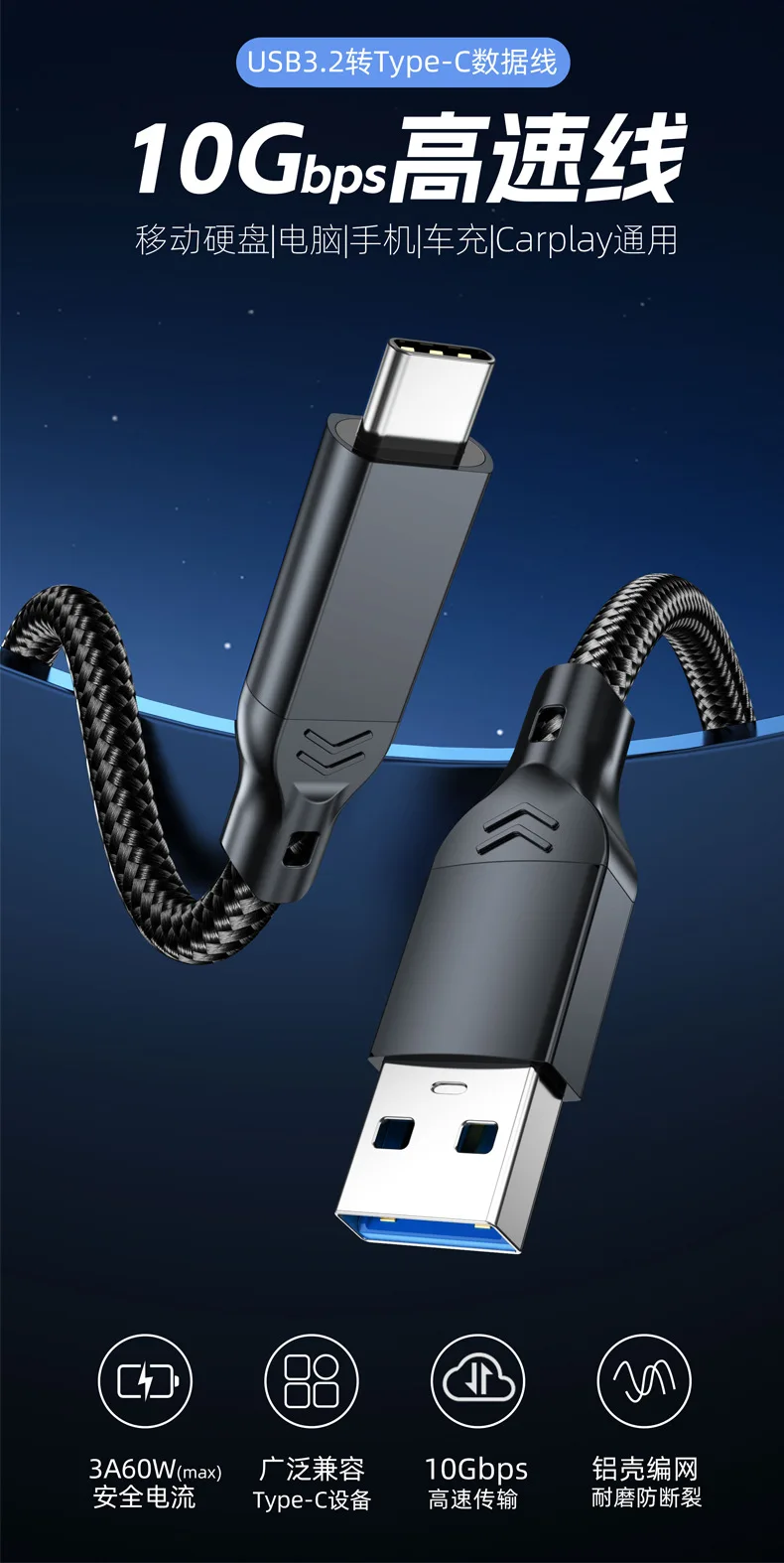 Cable USB3.2 Gen2 de 10Gbps, Cable de datos USB tipo C para disco duro externo, Cable de carga rápida de 60W para ordenador portátil, teléfono móvil 3,2