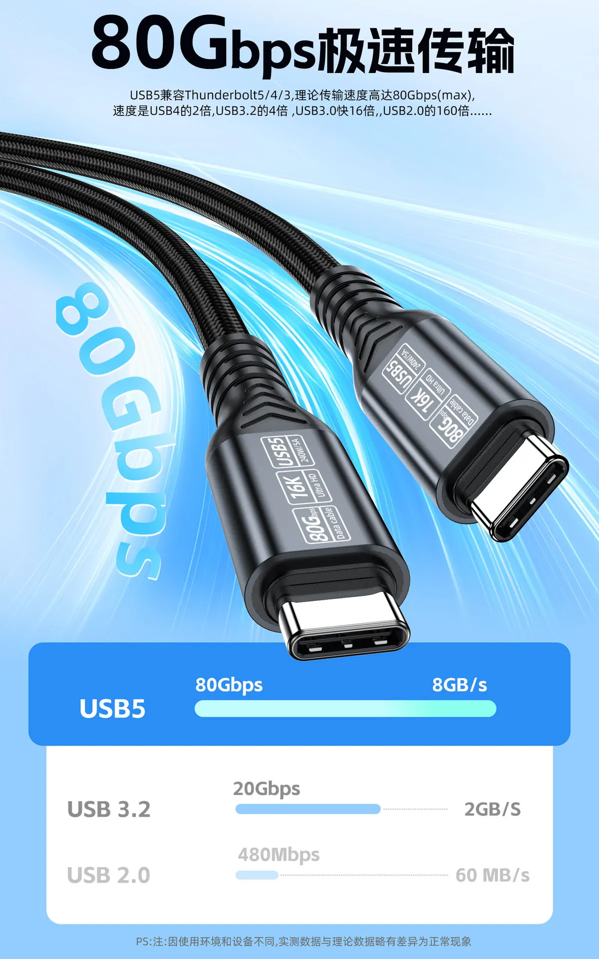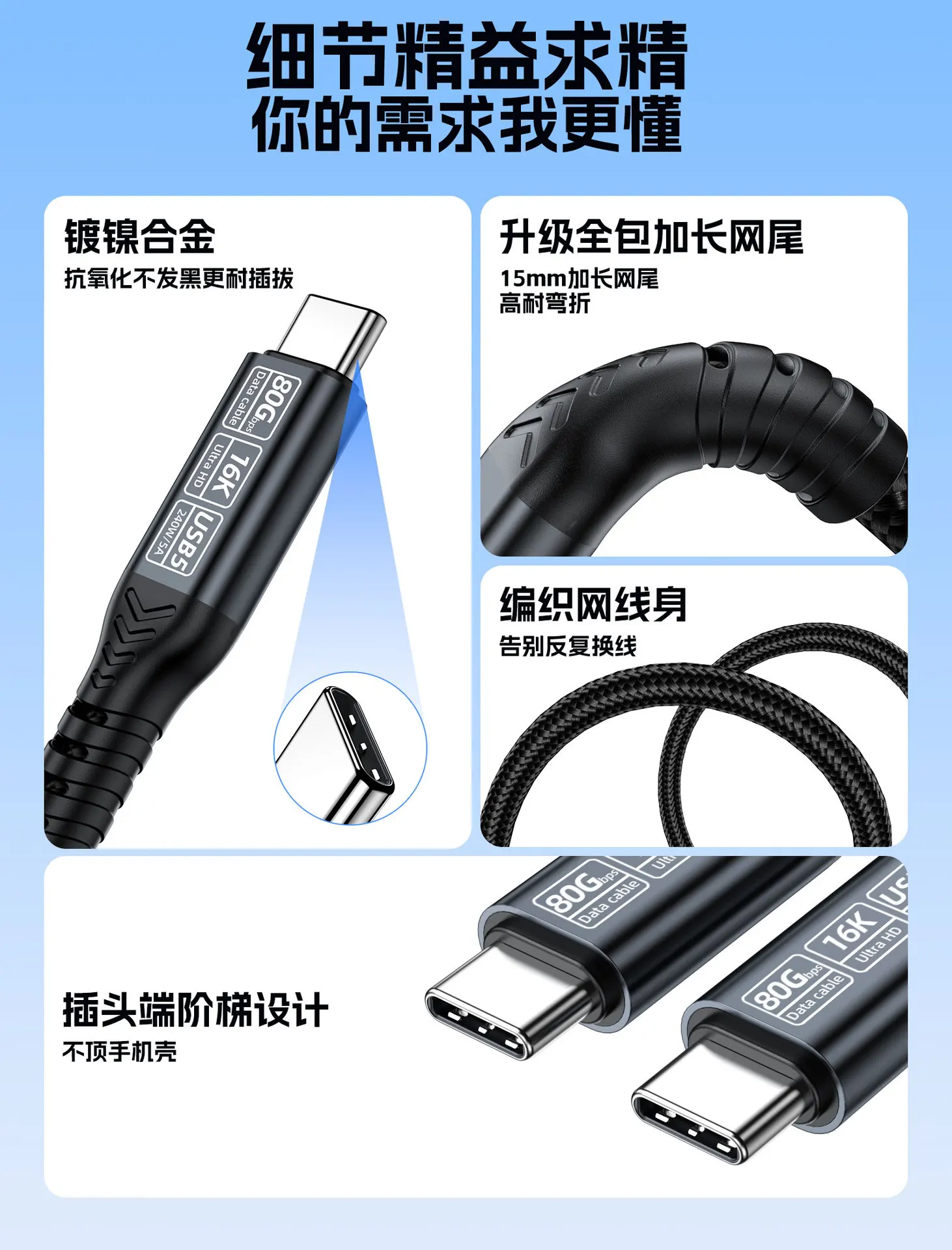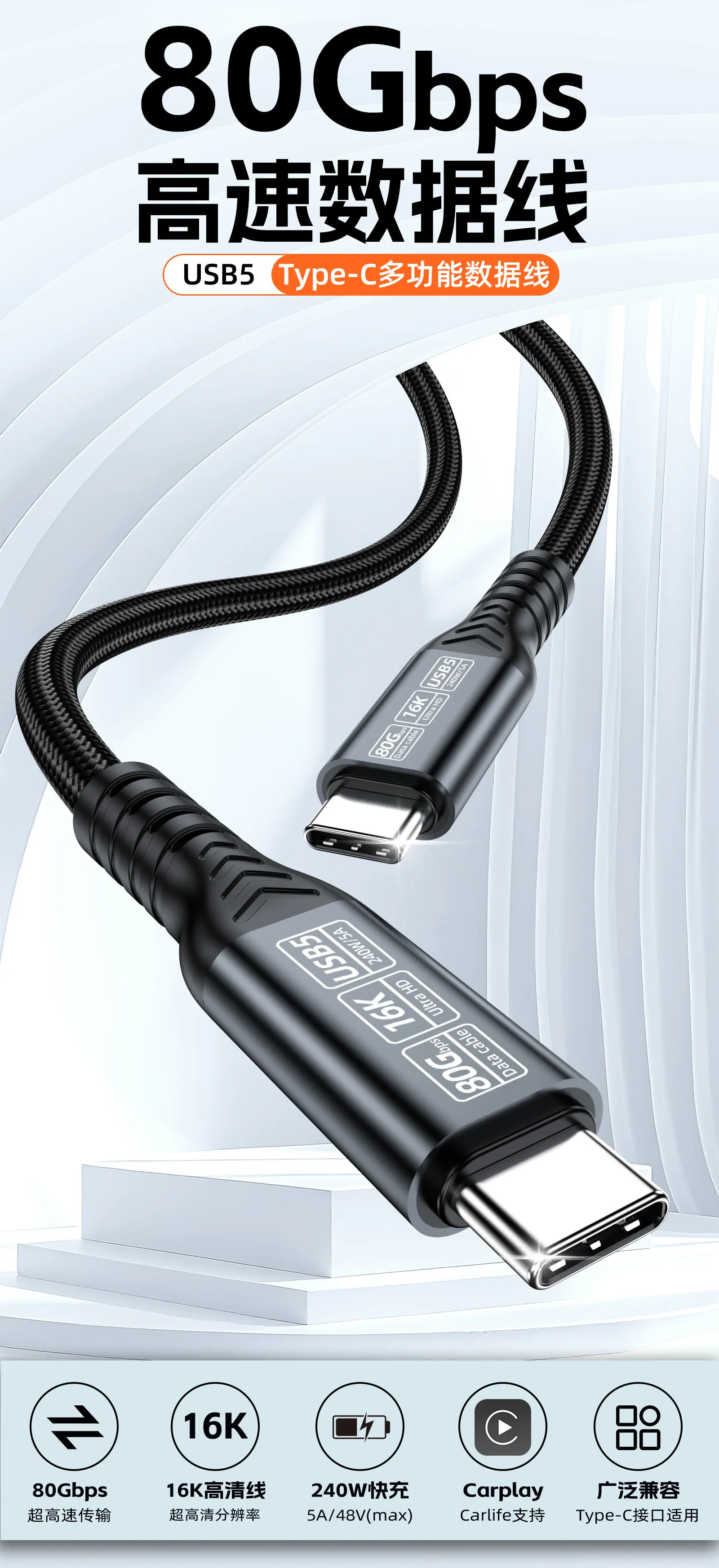 Cable USB5 tipo C de 16K, 60Hz, Cable de datos de transferencia de 80Gbps para disco duro, Cable de teléfono móvil USB C 4 PD 240W, carga rápida para ordenador portátil