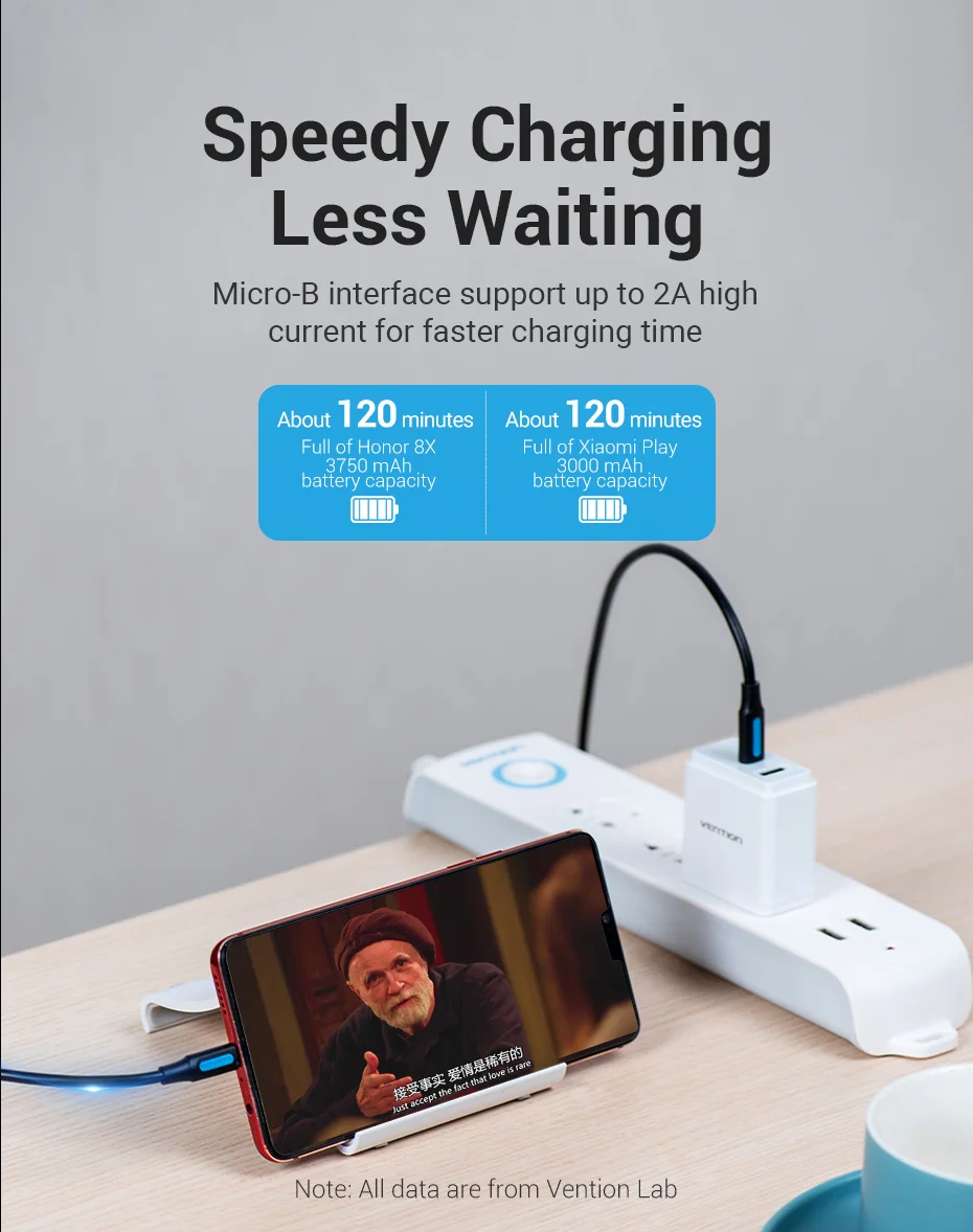 La interfaz Micro-B admite una corriente alta de hasta 2 A para un tiempo de carga más rápido