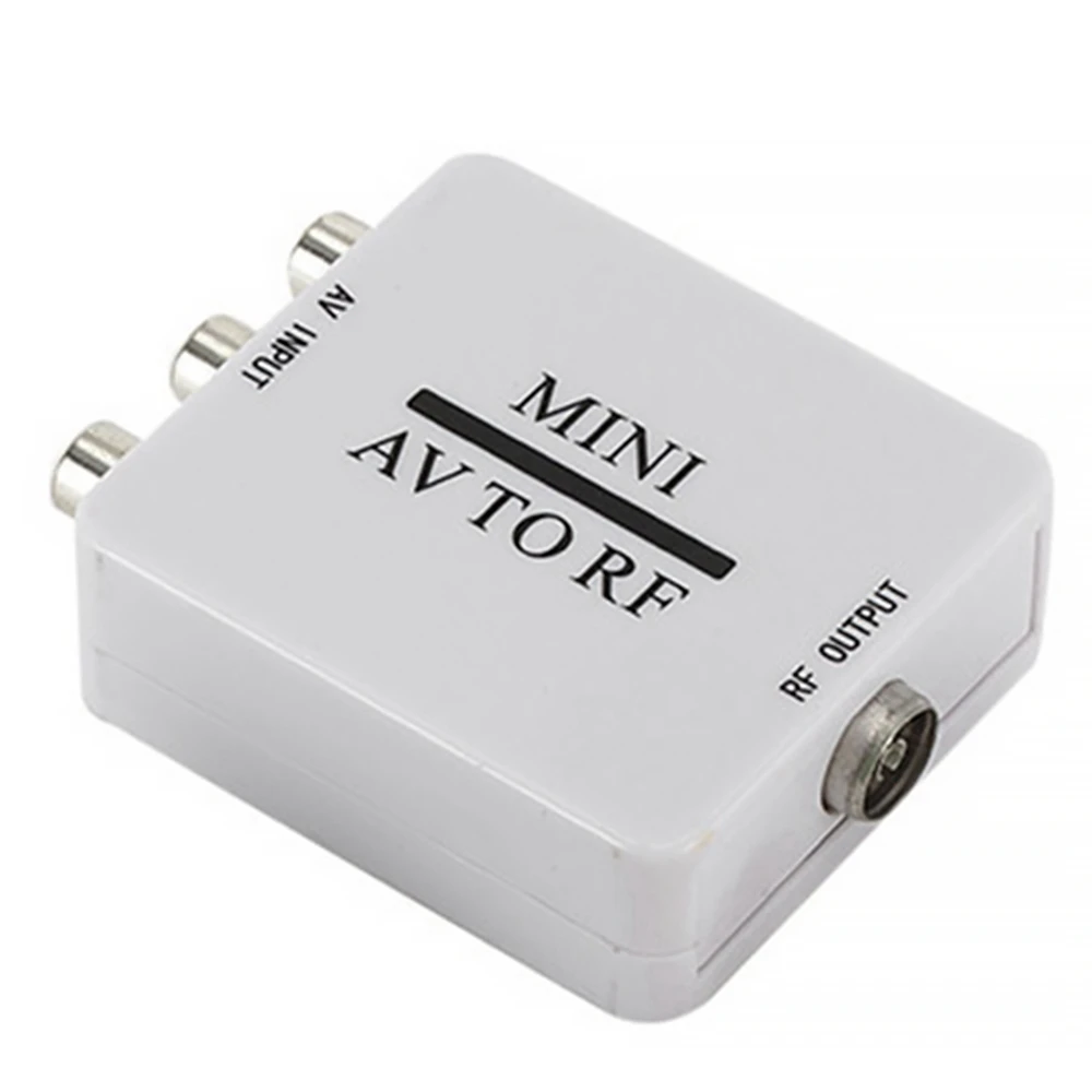 Caja Convertidora de Video HD RCA AV CVSB a RF Adaptador convertidor de Video Compatible con RF 67,25 Mhz 61,25 Mhz AV a RF TV scaler Switcher. No es necesario instalar controladores, portátiles, flexibles, plug and play. Baja potencia, sin adaptador de corriente. Este convertidor de señal AV a RF convertirá la señal de video o audio en señal de video compuesta RF y señales de audio, mientras admite señales laterales del sistema. Para que se pueda reproducir en la televisión, videograbadoras, grabadoras de DVD, etc. Tamaño: 2,36x2,09x0,79 pulgadas puertos de entrada: 1xrca Puertos de salida: 1xRF Frecuencia RF: 67,25 Mhz 61,25 Mhz Material: plástico Color: blanco contenido del paquete: 1 x convertidor AV a RF 1 Cable USB 1 x Cable RF solo el contenido del paquete anterior, otros productos no están incluidos. Nota: la luz y las diferentes pantallas pueden hacer que el color del artículo en la imagen sea un poco diferente del real. El error de medición permitido es +/- 1-3cm.
