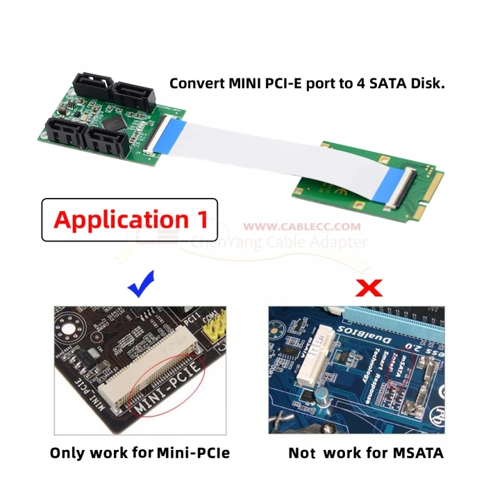 El adaptador admite desde Mini PCI-E PCI Express o NGFF A + E Key host a 4 discos de destino SATA.