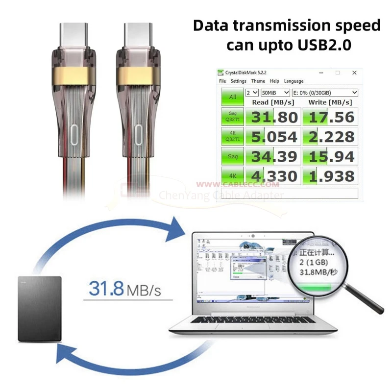 Función: Carga rápida 65W/3.25A + transmisión de datos USB2.0/480Mbps.