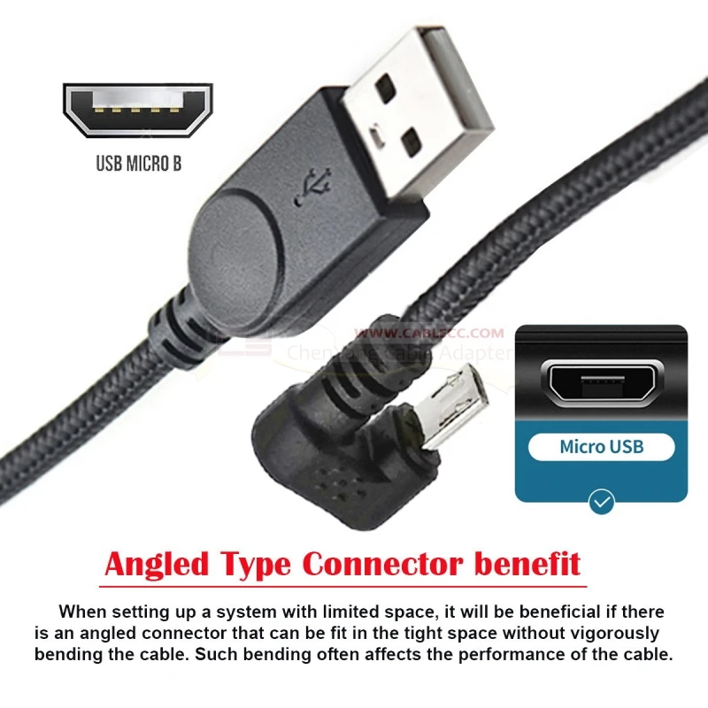 El micro USB de 5 pines está opuesto a la forma de U en ángulo trasero. El tipo en ángulo le permite conectarlo a un puerto hembra, incluso si el espacio alrededor del puerto es limitado.