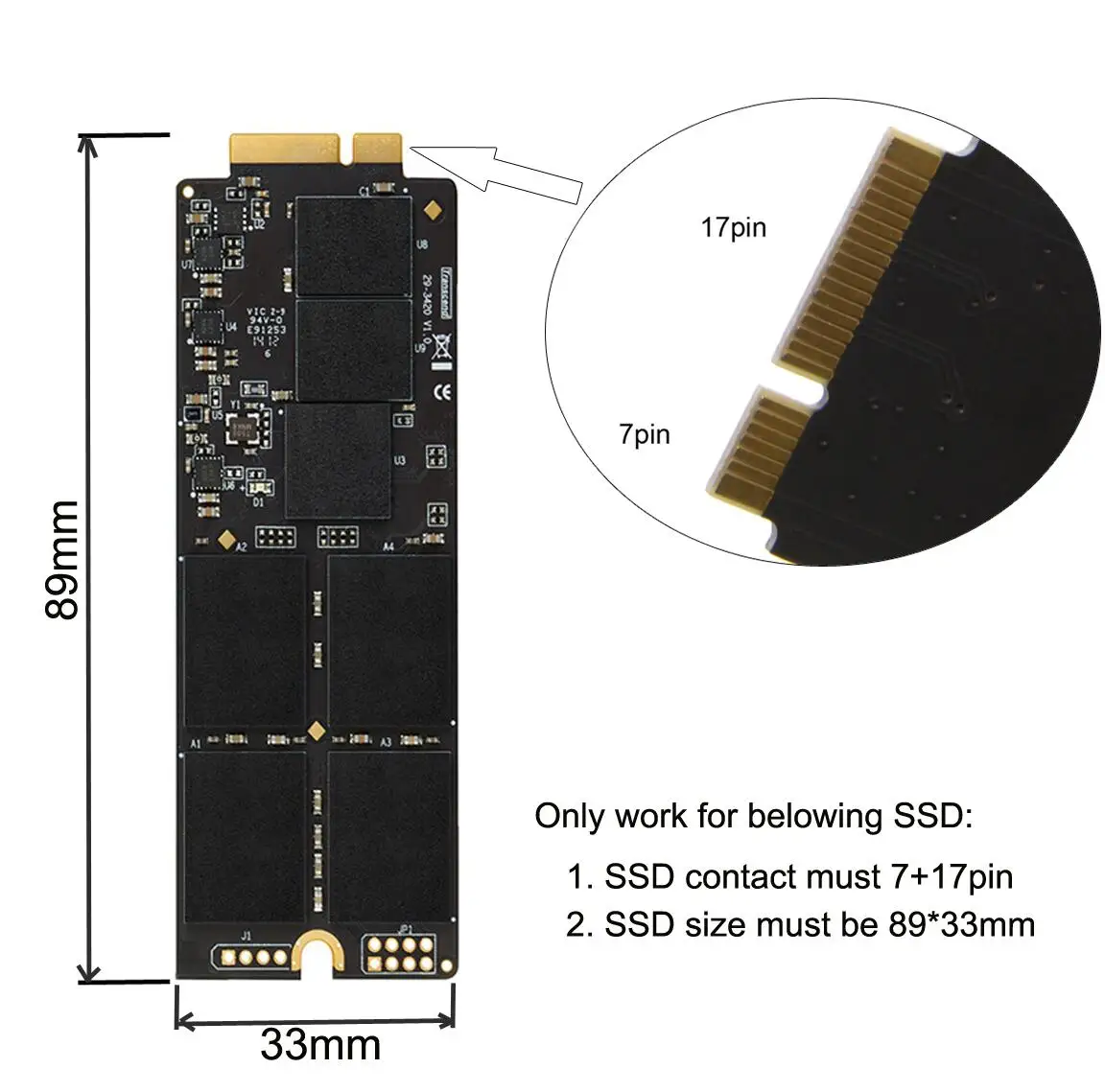 1. El SSD debe tener contactos de 17 + 7 pines. (Ver foto de abajo, de lo contrario no funcionará)