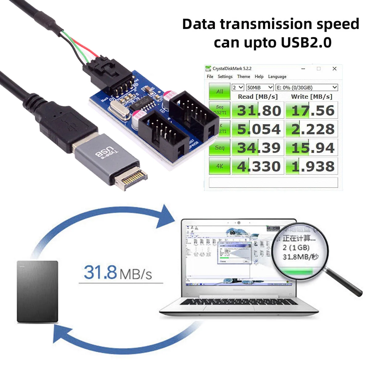 Cabezal de panel frontal CableCC USB 3,1Hombre Clave-ATipo-E 20Pin a USB 2,0 Tipo-A Macho 1 a 2 Placa base hembra 9pin 10pin Header HUB Adaptador Multiplicador de puerto