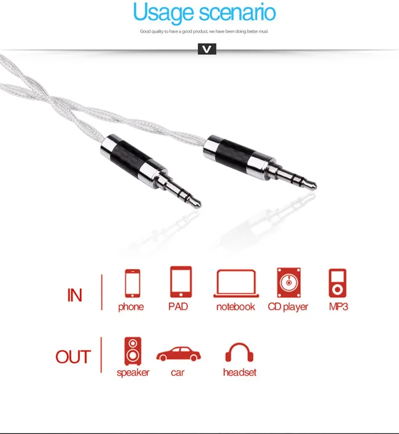 8. Para portátil, MP3 reproductor, radio, conexión de altavoz y transmisión de señales de audio, también adecuado para la transmisión de señal de vehículo.
