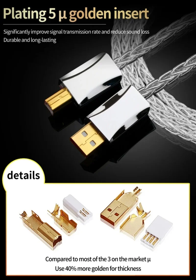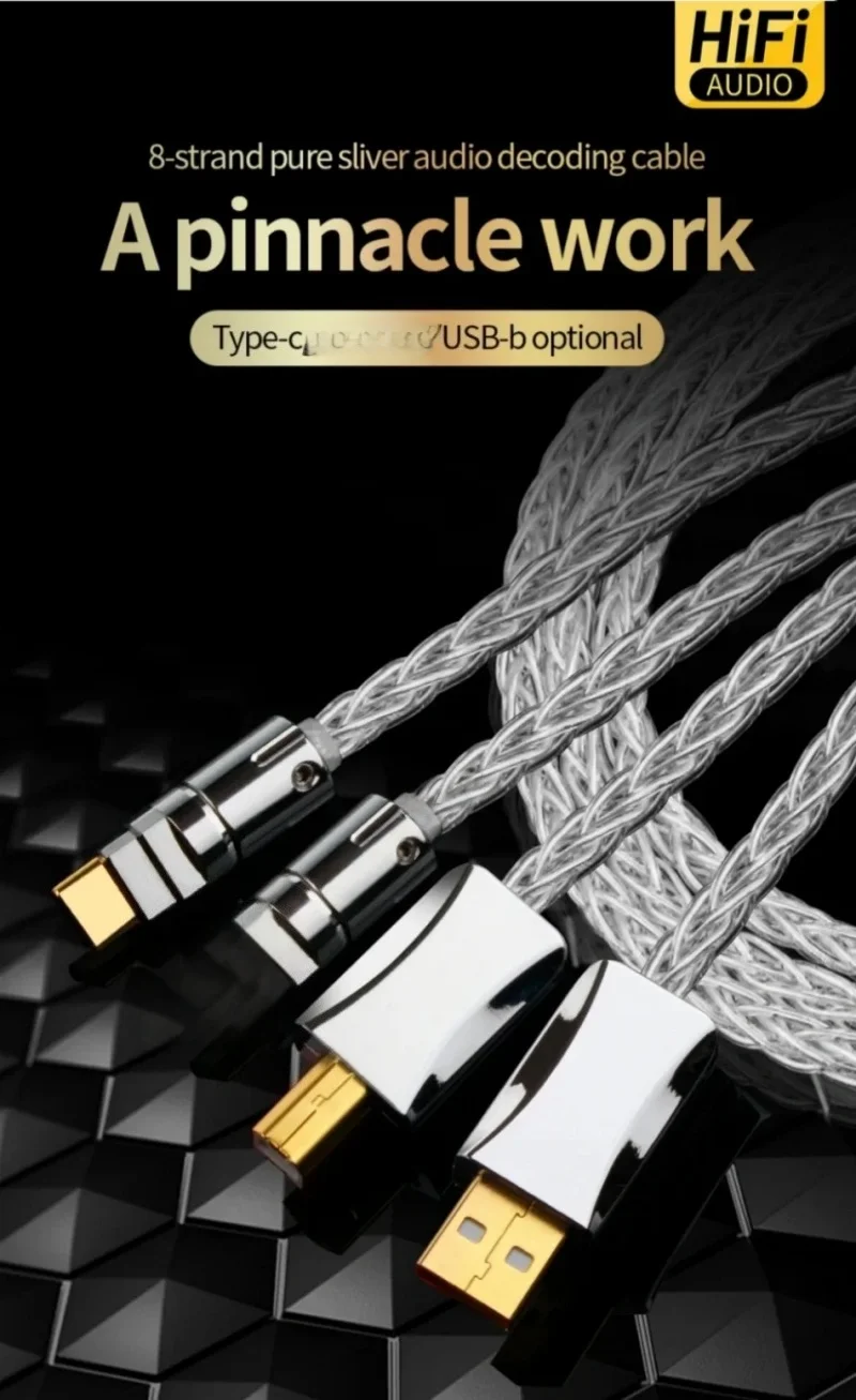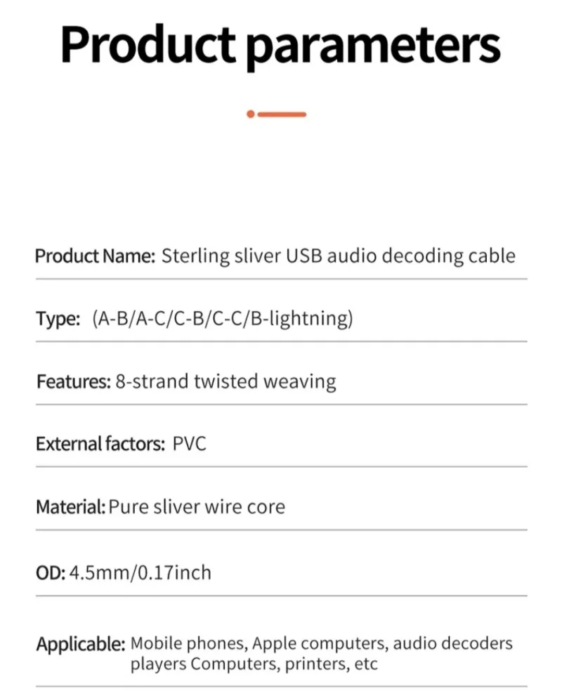 Cable decodificador de audio USB de plata esterlina Cable de datos DAC YS-2882.Color: Plata3.Longitud: 0,5 m, 1 m, 1,5 m, 2 m, 3 m4.OD: 4,5 mm/0,17 pulgadas5.Tipo: (a-b / a-c / c-b / c-c )6.Características: tejido trenzado de 8 hilos.7.Factores externos: PVC8.Material: núcleo de alambre de plata de ley9.Aplicable: teléfonos móviles, ordenadores, reproductores decodificadores de audio, impresoras, etc.