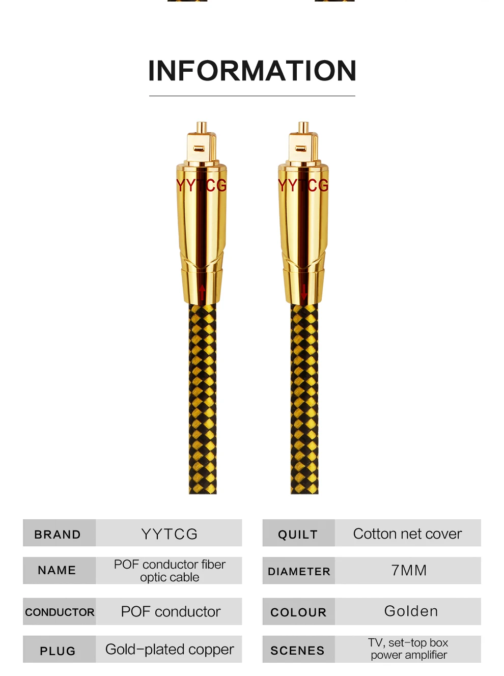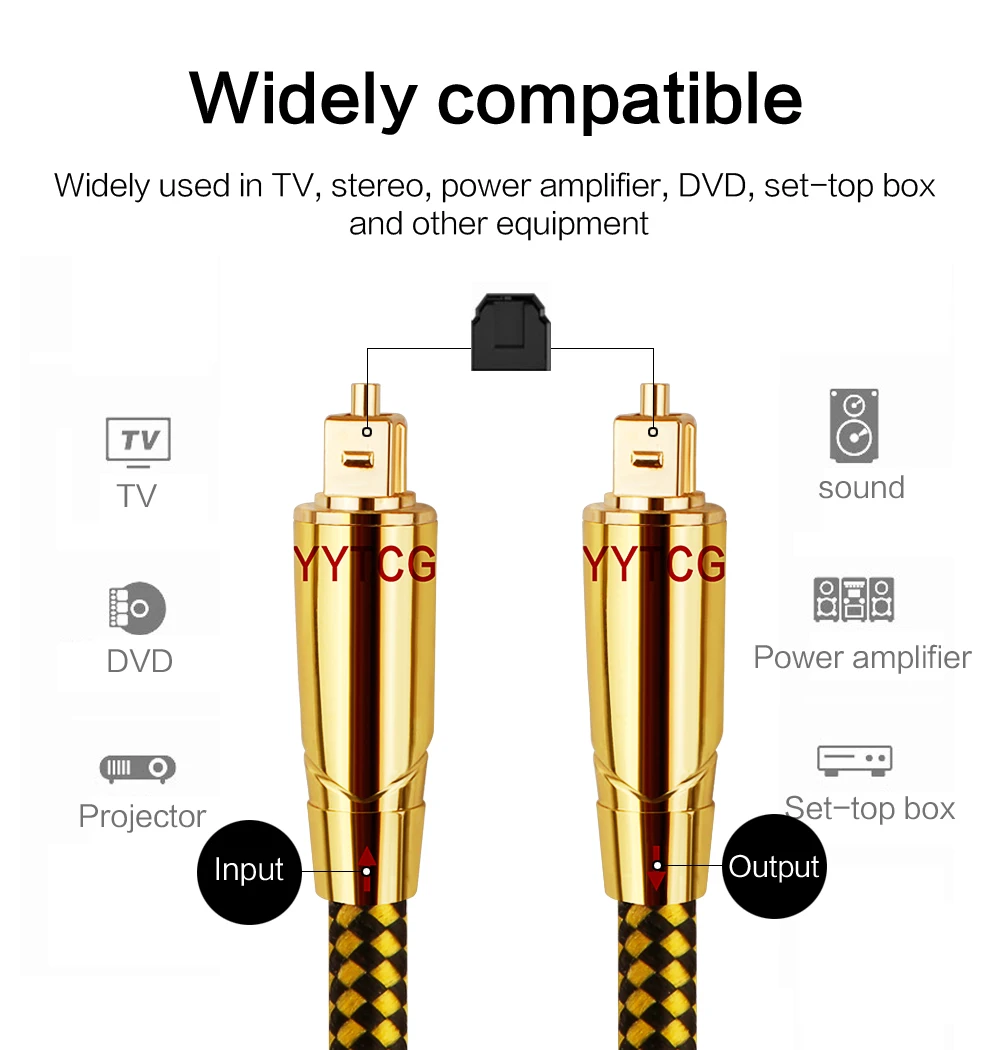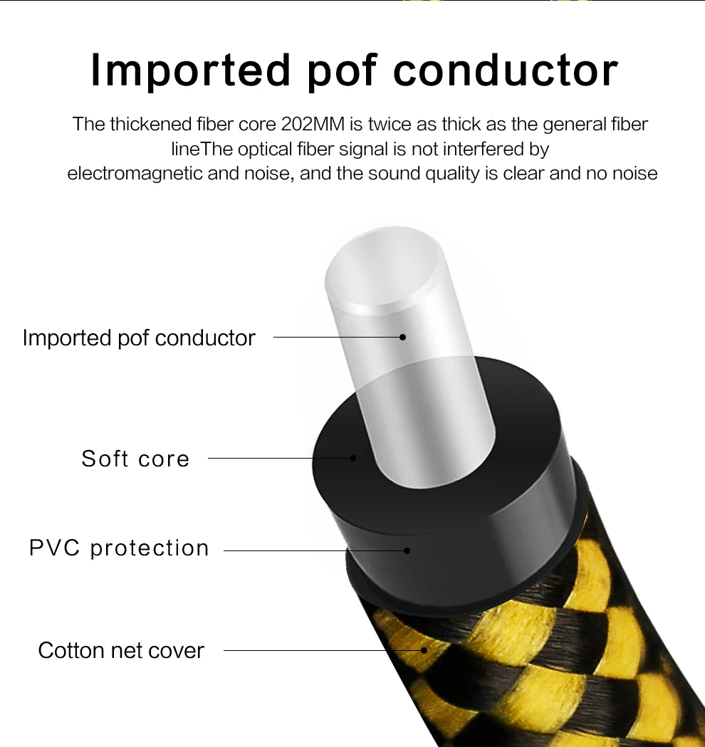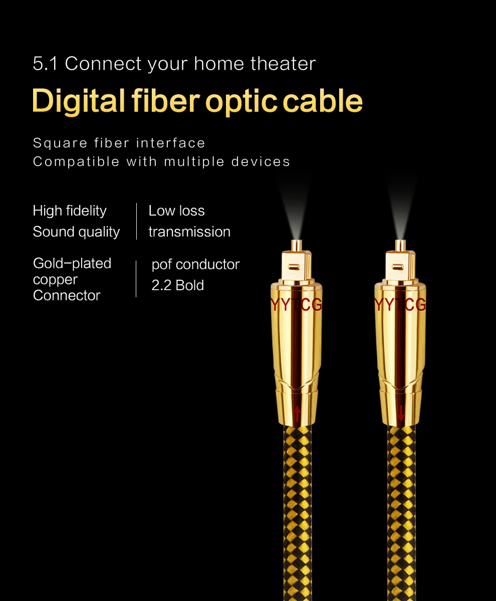 El cable de fibra de audio es un cable imprescindible para multicanal (5,1, 6,1 y 7,1) decodificación Dolby/DTS para una variedad de transmisiones de señal de corto alcance con terminales digitales de fibra óptica, amplificadores de equipos de comunicación y audio, reproductores de DVD, VCR, reproductor de CD, MD, AMP, PLAYER, mini disco, Convertidor de digital a analógico, receptor de satélite y dispositivo optoelectrónico, interruptor, tarjeta 1394, tarjeta de sonido de fibra óptica, decodificador de cable, cámara digital, copiadora, impresora, equipo de impresión, sensor de luz y equipos industriales, automóviles, equipos médicos y sistemas de energía
