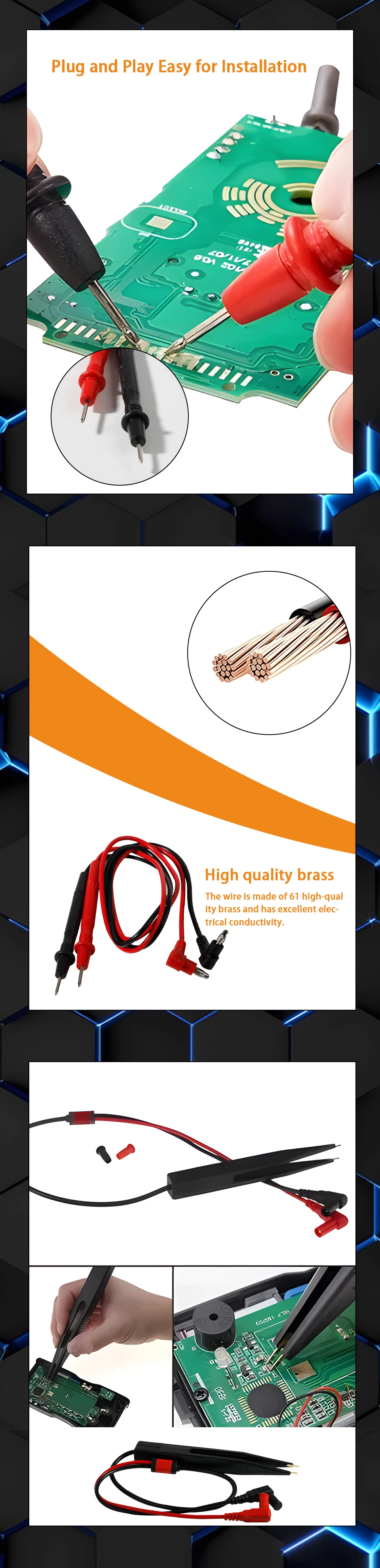 Multímetro Cables de alta calidad: La versión mejorada del producto, elcablesEstán hechos de silicona de alta calidad, resistente al frío y a altas temperaturas, muy suave y de uso más flexible.Un cable con doble aislamiento con 100 cables de cobre de alta pureza garantiza seguridad, baja resistencia y sin pérdida de señal.Los productos están bien diseñados y fabricados.