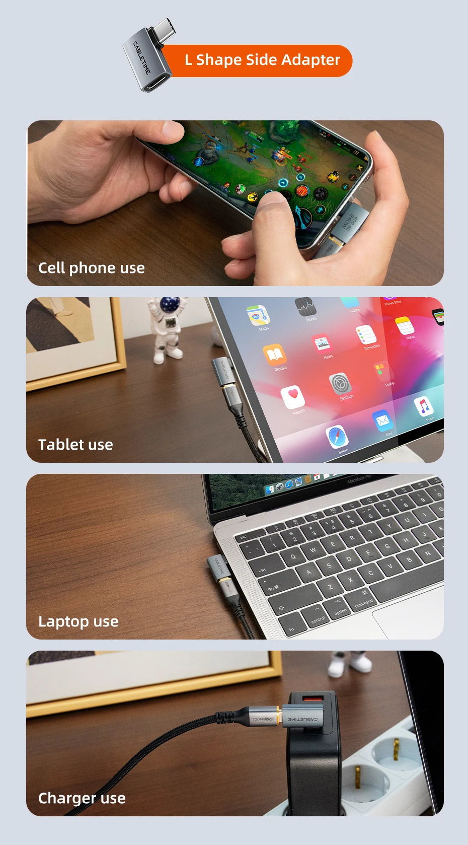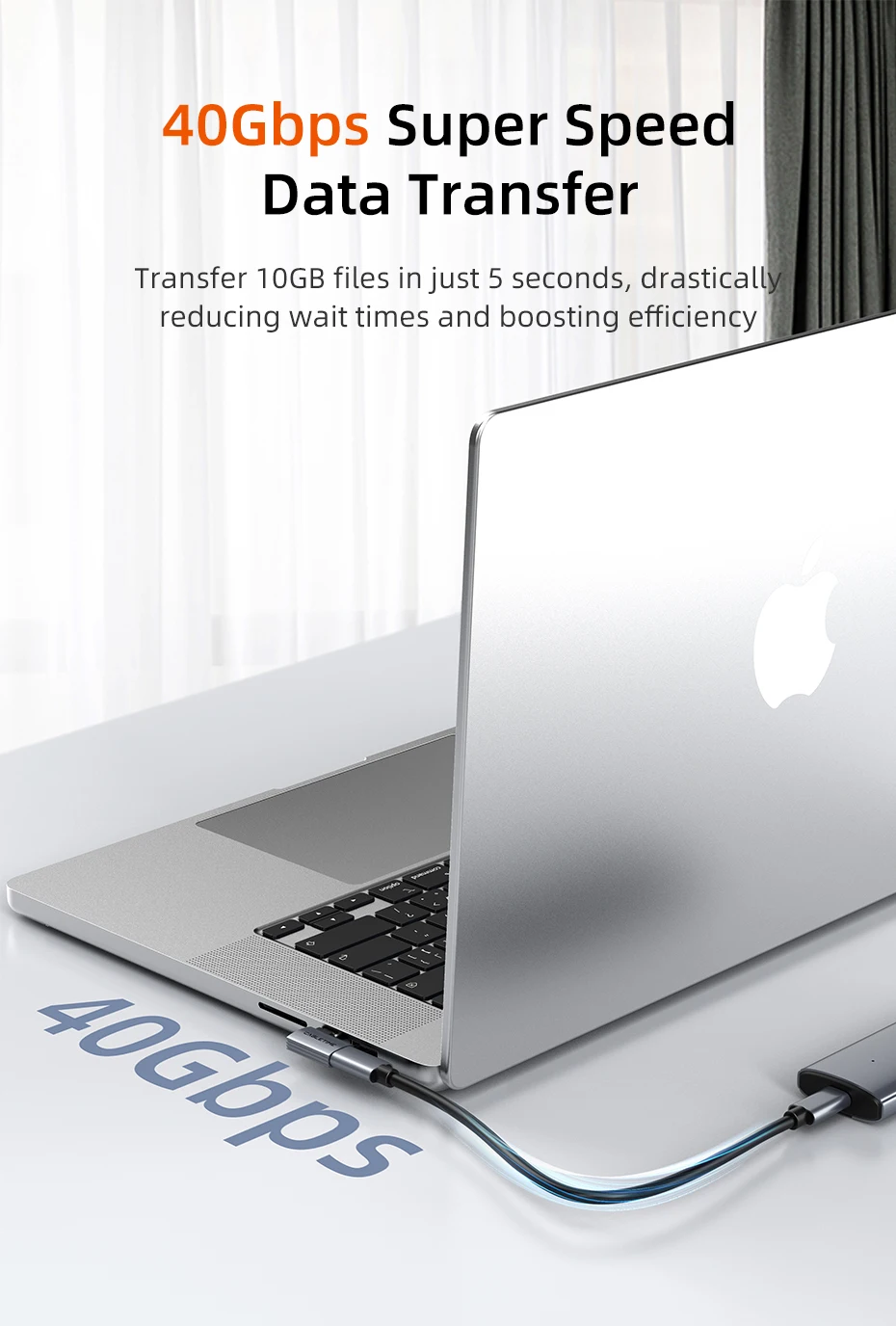 El adaptador de ángulo recto USB C Cabletime ofrece velocidades de transferencia de datos de 40 Gbps, lo que le permite mover archivos de 10 GB en solo 5 segundos.Disfrute de transferencias de archivos más rápidas y eficientes que ahorran tiempo y mejoran la productividad.