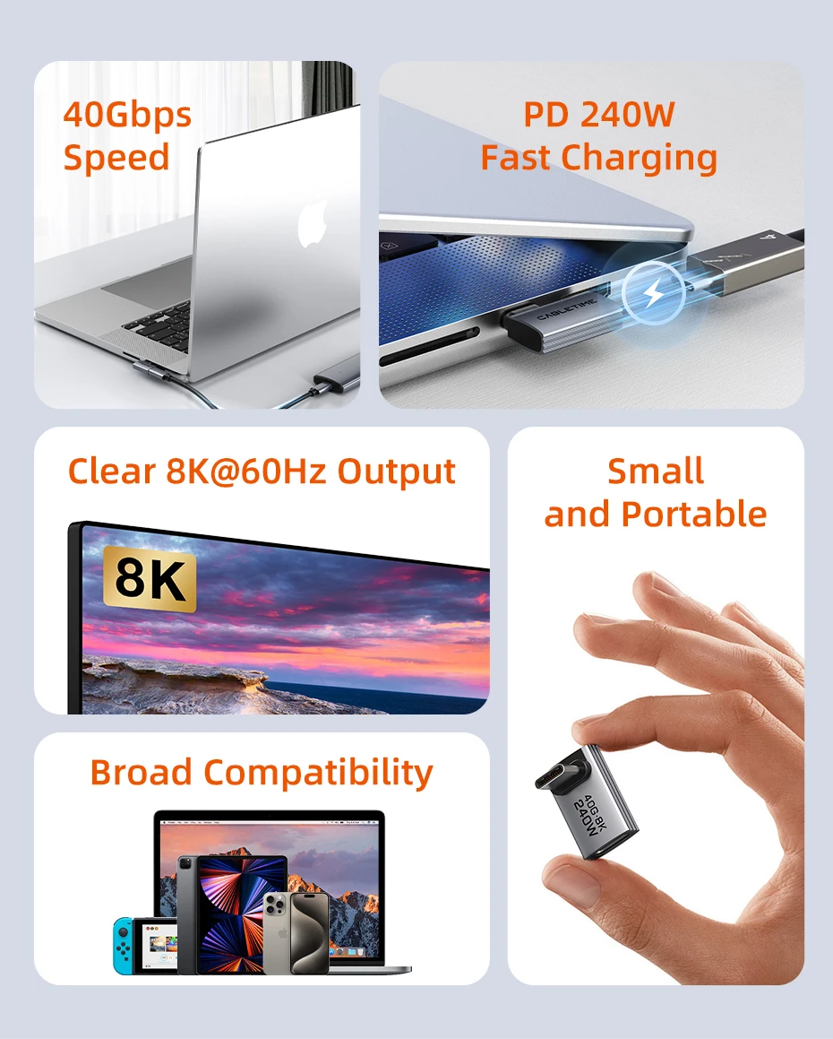 Admite transferencia de datos de hasta 40 Gbps; Admite carga rápida de hasta 240 W mientras es compatible con PD 3.0 y 2.0; Admite transmisión de video de 8K y 60 Hz (requiere compatibilidad con dispositivos para el protocolo de transmisión de video DP)