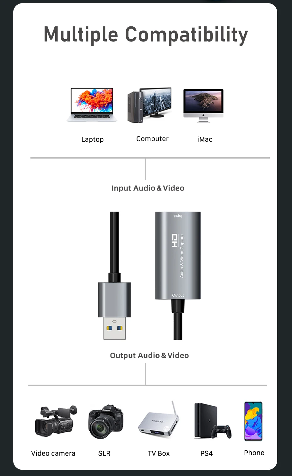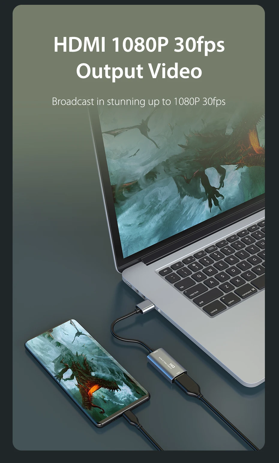 El adaptador de tarjeta de captura de video puede capturar video y audio simultáneamente y transmitir señales de audio y video a computadoras o teléfonos inteligentes para obtener una vista previa y almacenamiento.Por lo tanto, esta tarjeta de captura de video es adecuada para adquisición HD, grabación de enseñanza, captura de juegos, transmisión en vivo, imágenes médicas, reuniones en línea, etc.Fácil de transportar, compacto y portátil, sin fuente de alimentación externa. Puede disfrutar de videos mucho claros para su grabación, transmisión en vivo, etc.