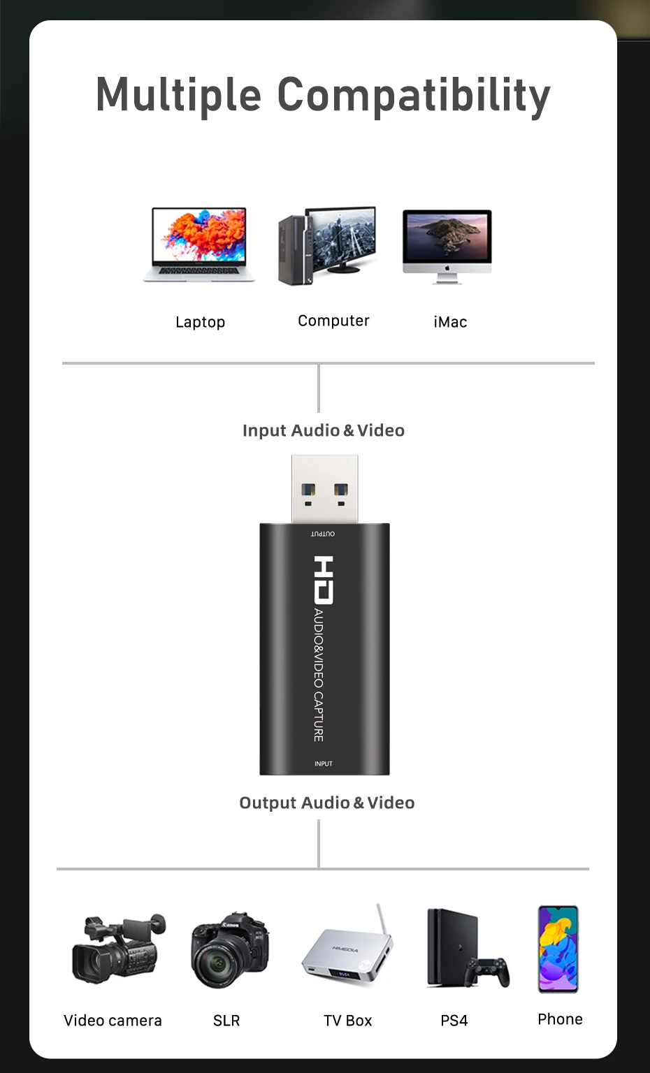 Este adaptador de captura de vídeo es una forma rápida, familiar y económica de compartir contenido en salas de conferencias y reuniones en línea.Conéctese a presentaciones sin software, simplemente conéctese a una computadora portátil o tableta a través de la tarjeta de captura y el cable para comenzar a compartir.Y hace que la transmisión en vivo, el uso compartido y la grabación sean simples y rápidos.