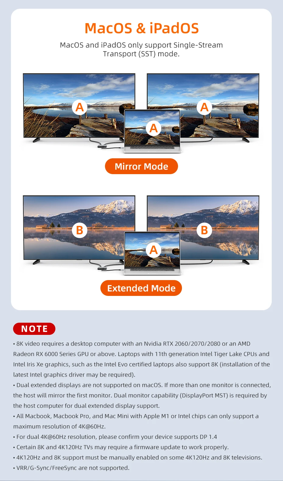 • Pantalla única de 8K a 30 Hz • Pantalla MST dual de 4K a 60 Hz • Súper carga de 100 W