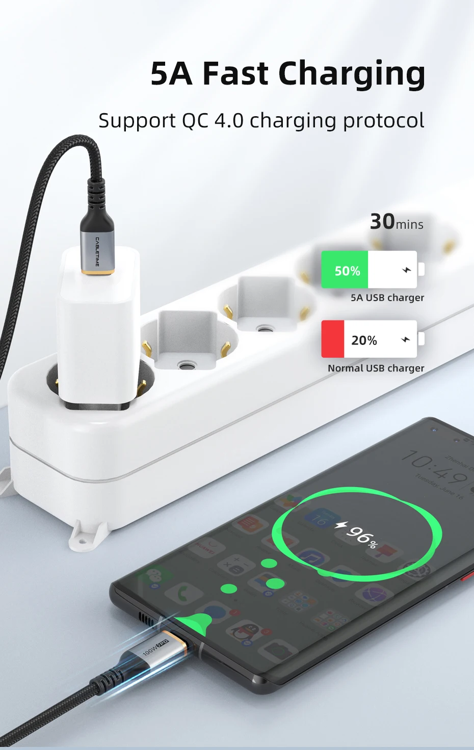Comprar CABLETIME-Cable PD de 100W tipo C a USB C, carga rápida de 480Mbps, 5A, QC 4,0, Chip e-maker para Macbook Pro, Dell, ASUS C437